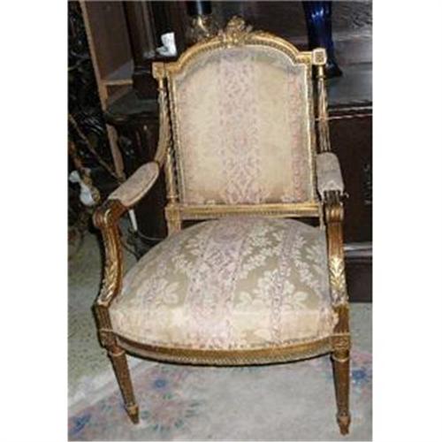 ntique Giltwood Armchairs with original upholstery and gilding. Some of the fabric is freyed at the edges and a bit discolored it needs to be either cleaned or replaced. If left as is, the chairs have a true "Shabby Chic" look.