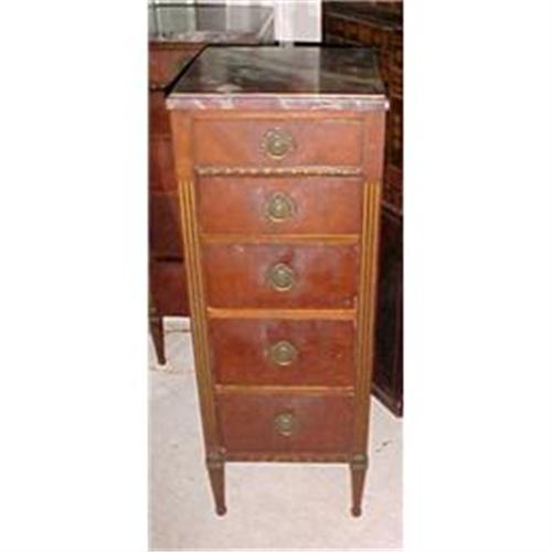 This is a wonderful pair of French five drawer nightstands/commodes having marble tops, dore bronze mountings, fluted edging and original hardware.