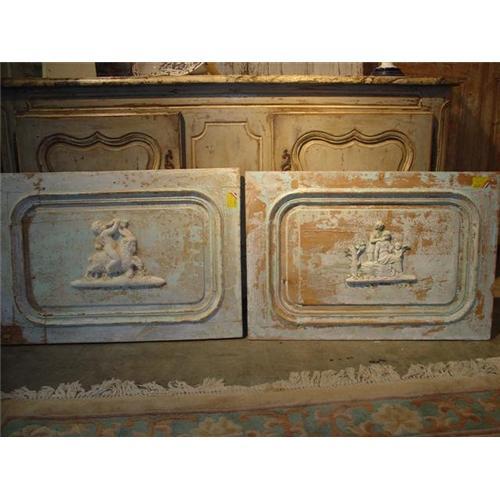 This is a pair of French antique wooden overdoors with appliqued (sp?) plaster reliefs. They are in good condition and from the late 1800's. One of the overdoors reliefs depicts a putto riding a ram, while the other overdoor depicts a man and a woman on a bench in a garden, with the womans hand touching cupid.