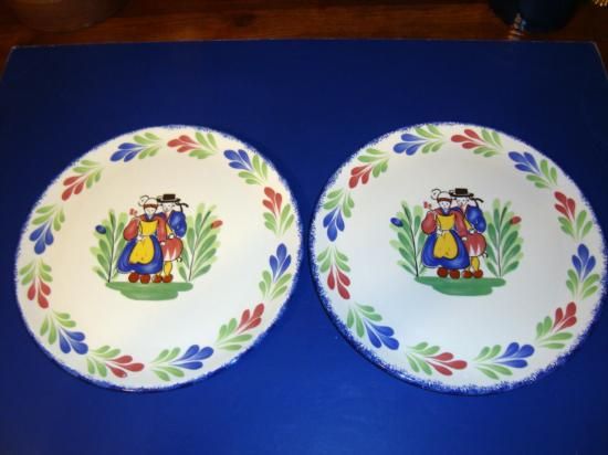 A very nice pair of large French faience/ earthenware plates made by Pornic, France. Each plate was hand-painted by the artist (On the photo, you can see the stamp to guarantee this signature of the "Faiencerie de Pornic"). Excellent condition (No cracks, no chips). This kind of plates made in Pornic, Brittany is highly collectible in France. Lovely pieces for your collection or for the decoration of your home! We ship from Texas (not from France)! Diameter: 10.5" We have 9 plates available.