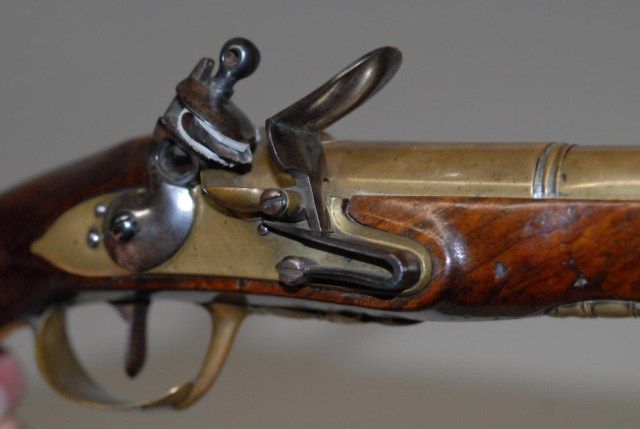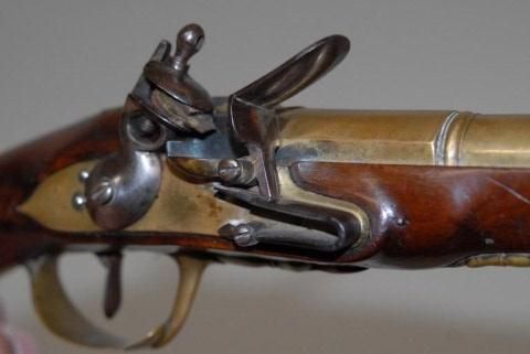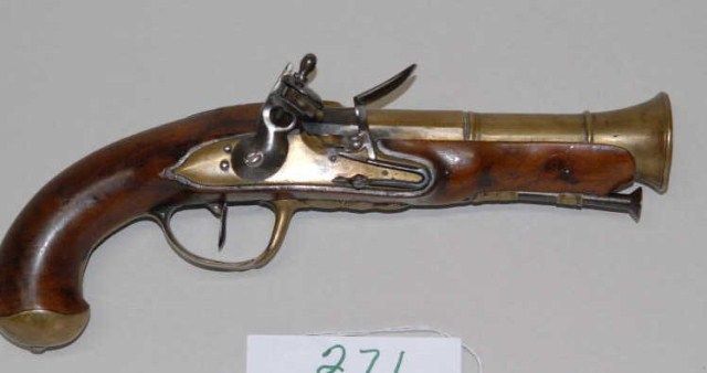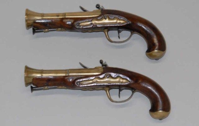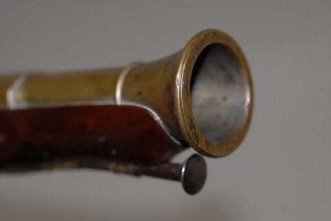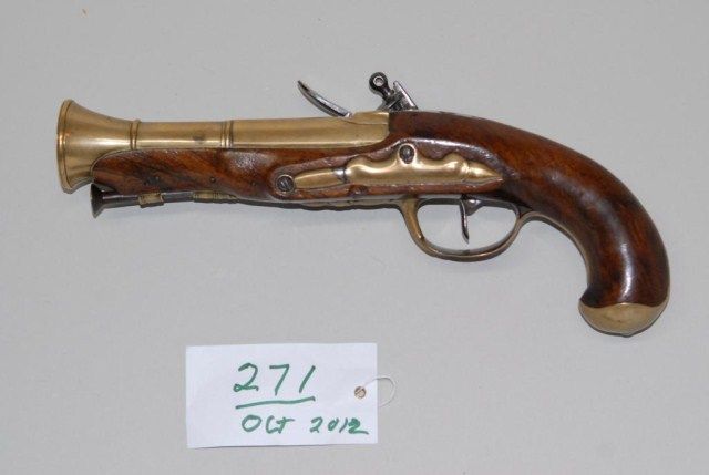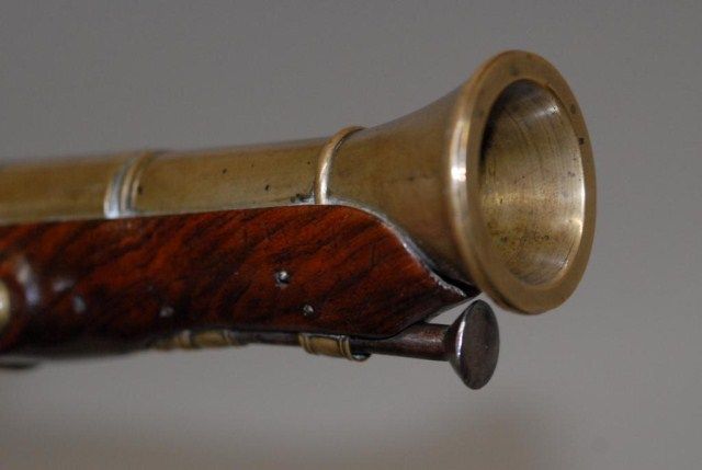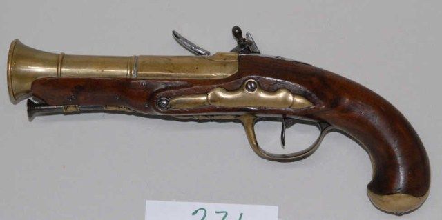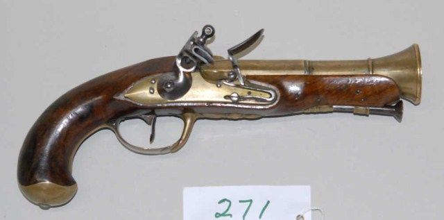 Pair of French style flintlock blunderbuss pistols circa late 18th to early 19th century with brass barrels, lock plates and mounts. The pair measure 12-3/4” overall with 7” cast naval brass barrels that are made in three(3) stages and flare to 1 7/8” across the center of muzzles and about 1-1/4” bore. The pair remain in very good original condition retaining original flintlock parts. The stocks are also very good with a couple ofchips, small losses and normal aging. Though not marked or signed these are nearly identical to known examples made in St. Etienne in the late 1790’s. Pairs of blunderbuss pistols are rarely encountered.Est.; $5,000-$10,000