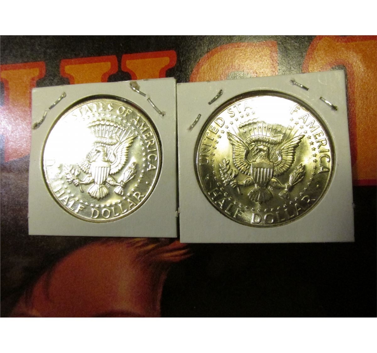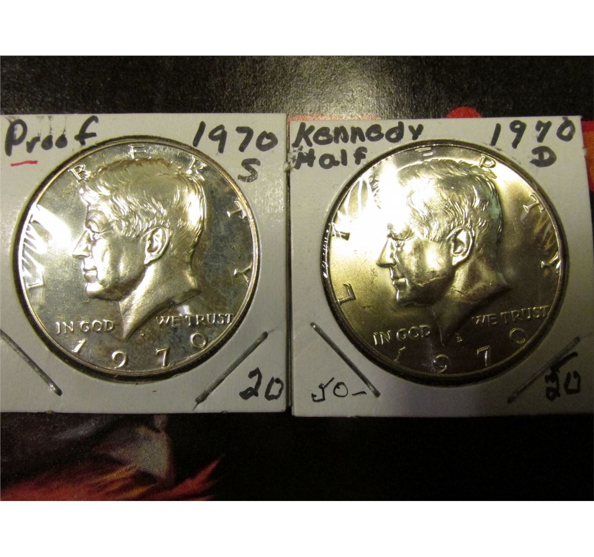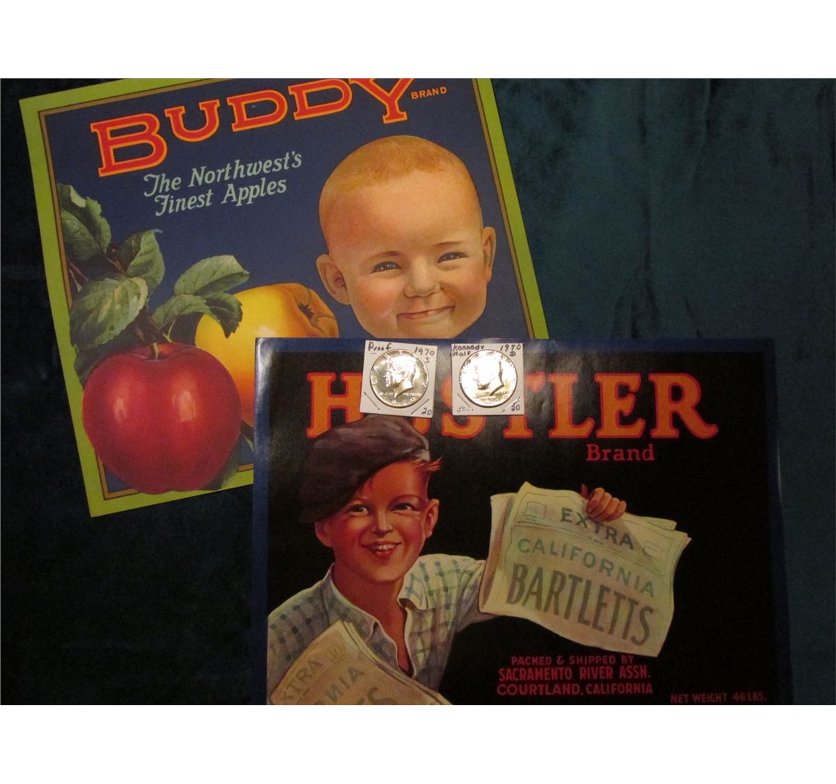 Pair of Fruit Box Labels; 1970 D BU & 70 S Proof Silver Kennedy Half Dollars.