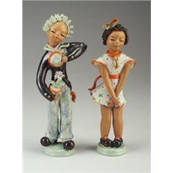 Pair of GOLDSCHEIDER figurines of a boy and girl, in polychrome glazes. Restoration to boy in sev...