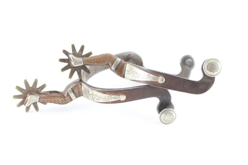 Copper and silver engraved, engraved silver buttons double mounted brown iron 1 1/2" 10 point rowels.