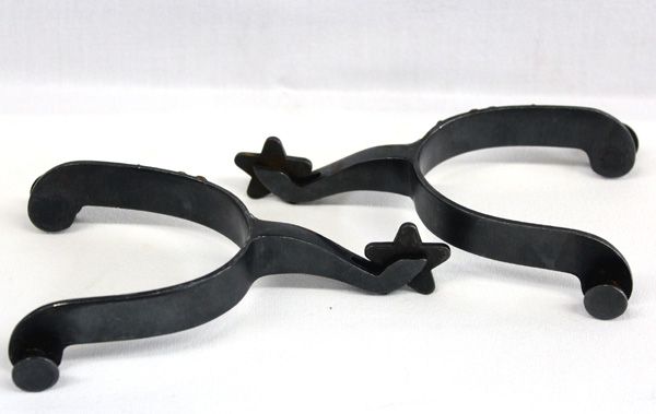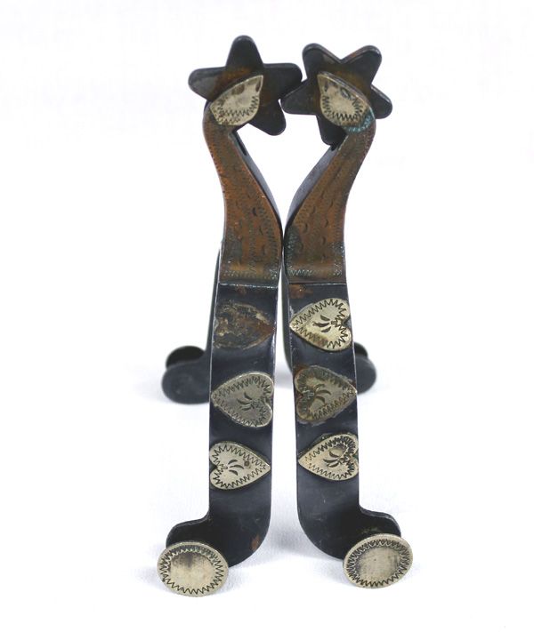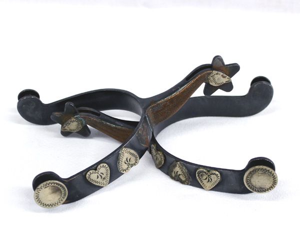 Pair of Gal leg Spurs. Single mount silver plate heart decorated and copper and silver plate birds on shank. This Pair has a measurement of approx.: Rowls 1 1/8'' Shank - head 2 1/4'' long. (missing heart on one.)