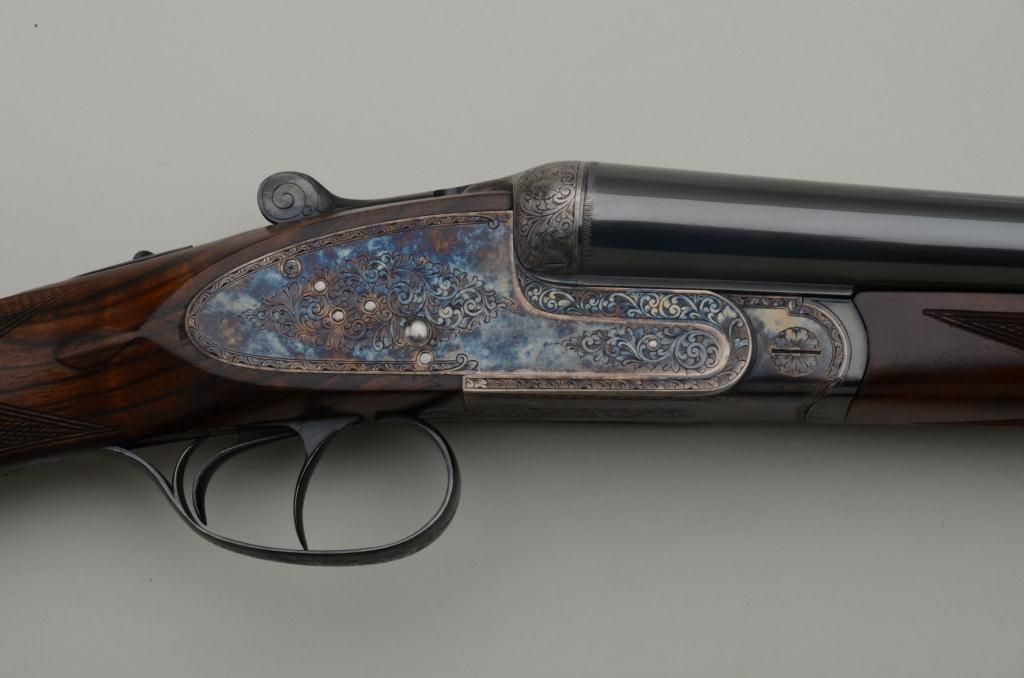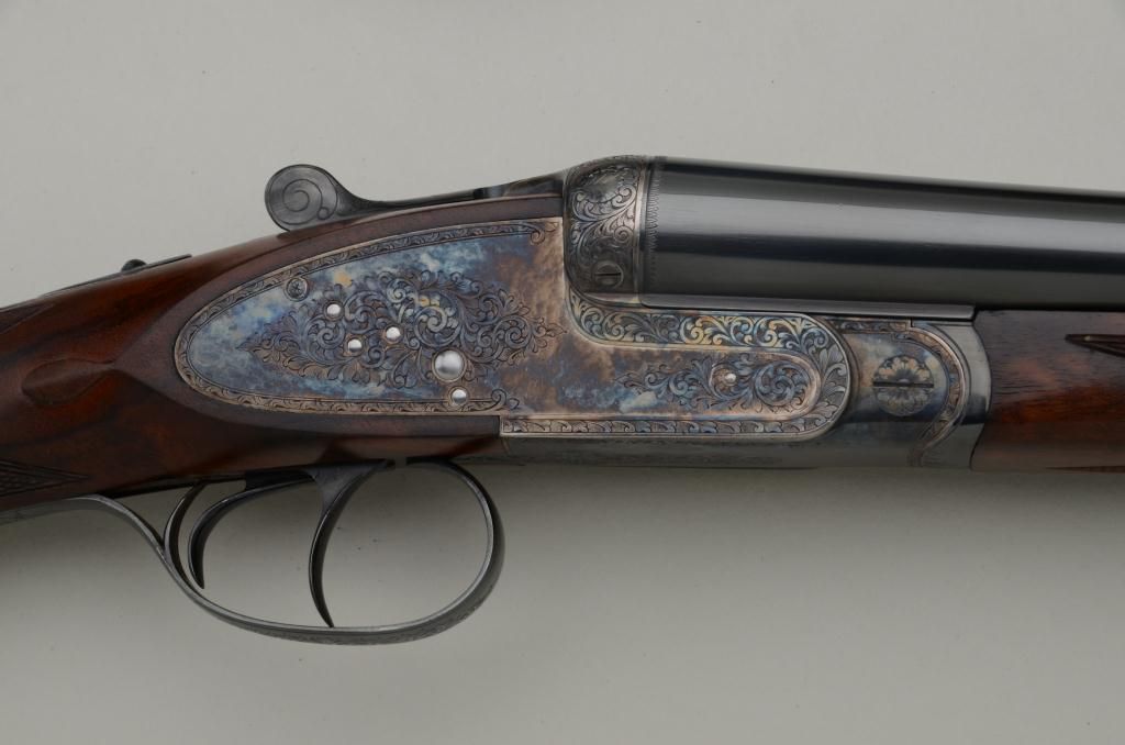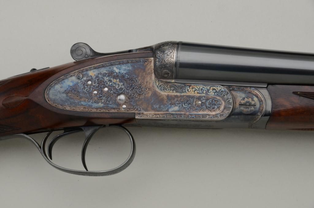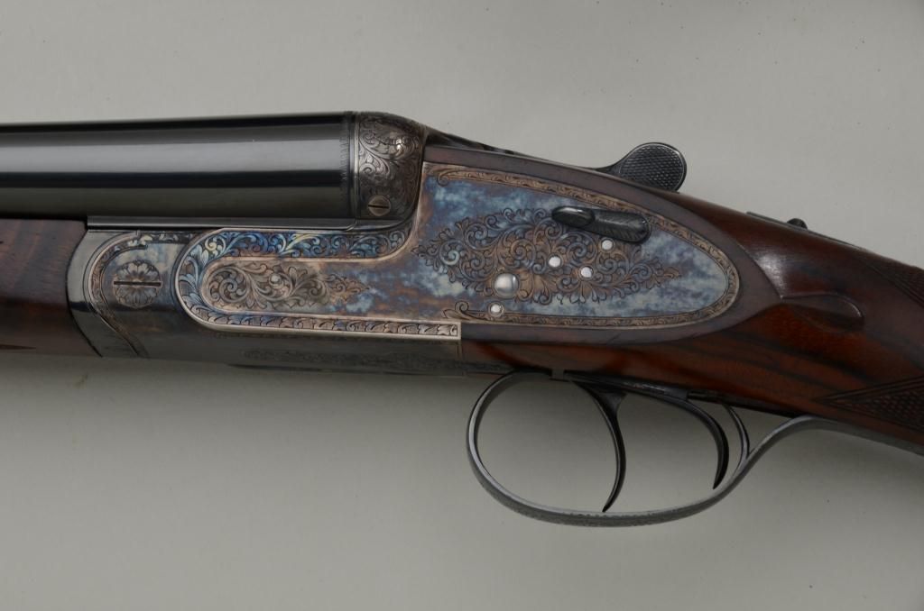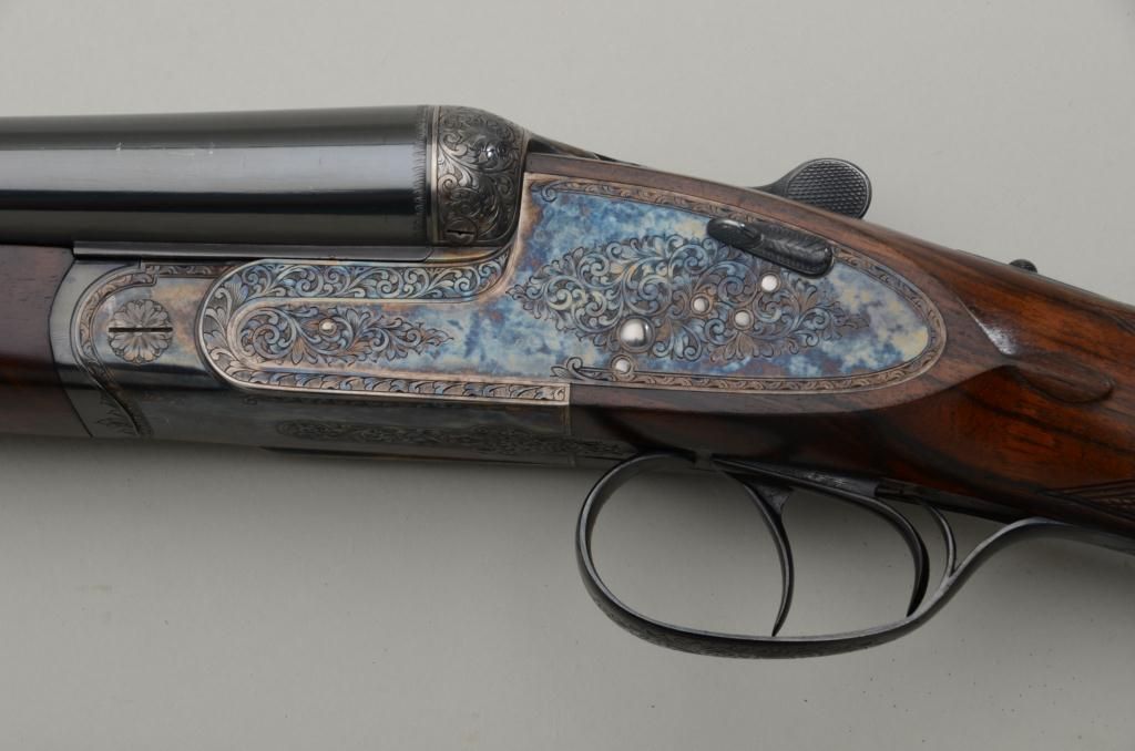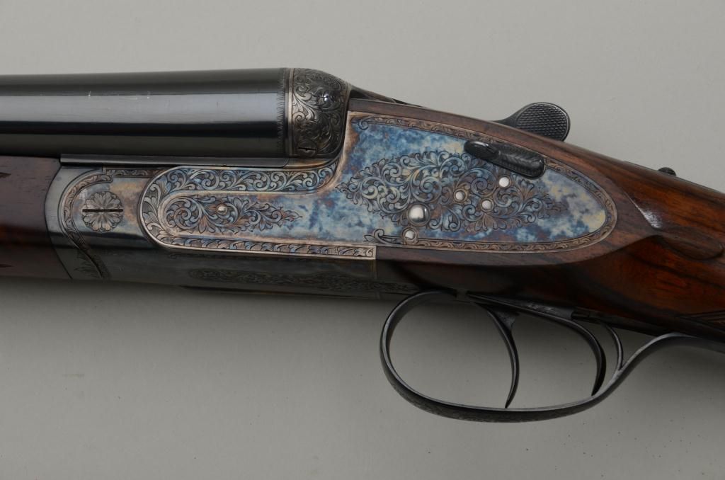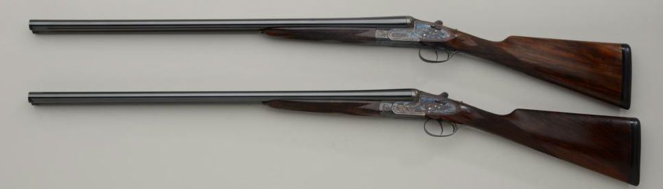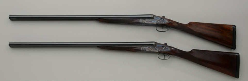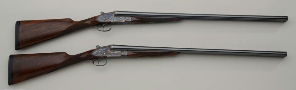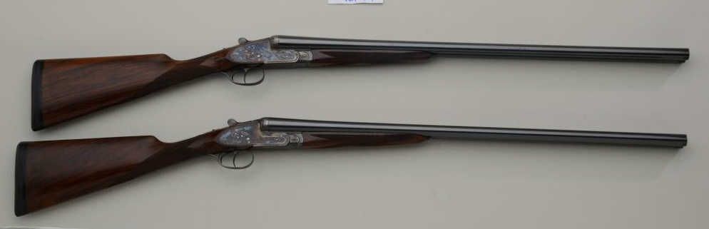 Pair of Garbi (Spain) Model 101 game guns with full side lock actions in 12 gauge. Showing full side lock actions, 28” barrels, double triggers, auto ejector’s with luggage type canvas and leather carrying case withfelt interior. The pair are serial numbered 27 -03- 05-95 and 27-03 -06-95. The guns are matched in dimensions with the left barrel being choked modified and right barrel being choked improved cylinder. Stocks measure 145/8” to the end of a English type pad with 2 ¼” drop at heal and 1 ¾” drop at comb. The pair are slightly cast off measuring approximately ¼” at heal and 1/8” at toe. There are no barrel problems and the barrelsare mounted with low rise non-ventilated ribs. The condition is fine to near excellent with 90% to 98% original finish showing just some minor operation and slight use. The frames are nicely scroll engraved and casehardened. The pair show William Larkin Moore importers marks and Spanish manufacturer proofs. Garbi is a value for the money they cost and you get a lot of bang for the buck. Replacement value $22,000 plus depending on