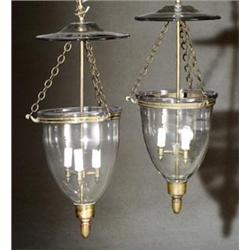 Pair of George III Style Brass and Blown Glass Three-Light Ceiling Fixtures