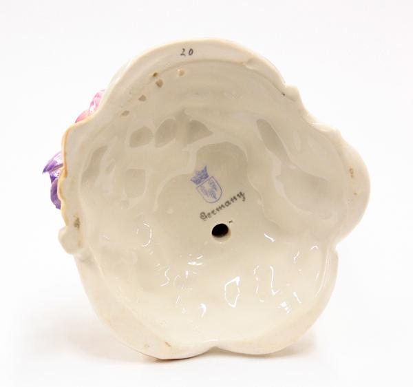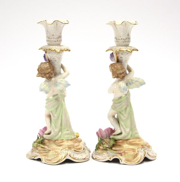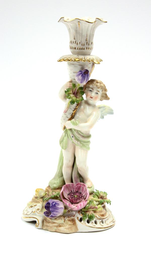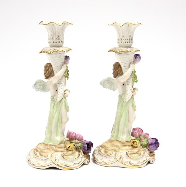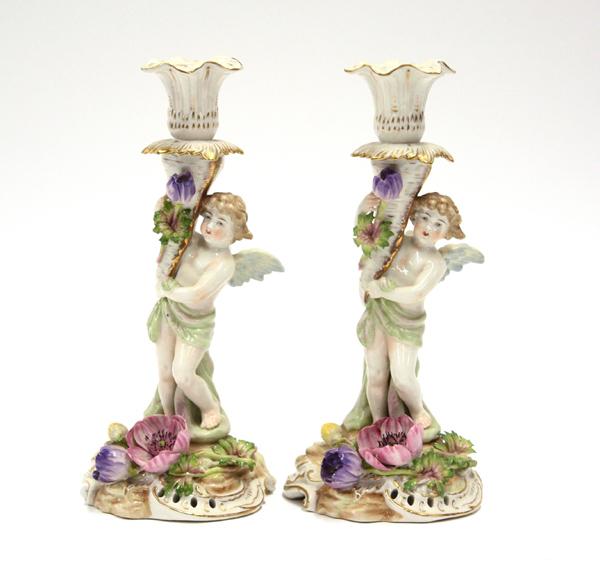 Pair of German porcelain candlesticks, each polychrome decorated and supported by a standing winged putti rising on a naturalistic base having applied floral sprays with gilt accents, marked with overglaze crown above Germany, 9.5''h
