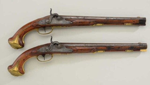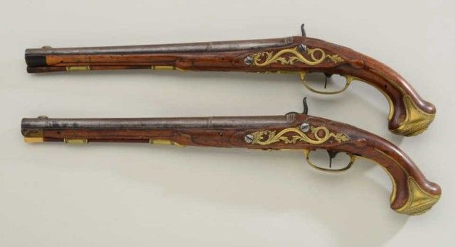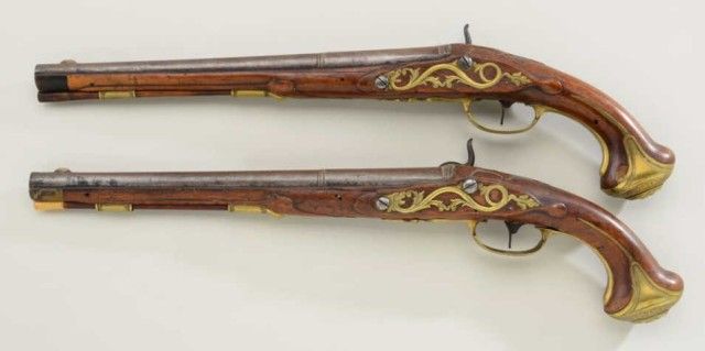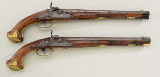 Pair of Germanic Horseman’s size pistols circa about 1725 converted from Flintlock to percussion and signed “Meckel A. Suerin”. The pistols show nice quality engraved brass mounts with pierced serpentine type sideplates and ornate mask butts which show traces of gold gilt. The pair measure 20” overall with 13” barrels of approx 52 cal smooth bore. The metal surfaces are good with a light coating of surface rust andminor pinprick pitting needing a cleaning. Both stocks show small repairs in the fore ends and one pistol shows a large chip by butt cap but otherwise good with sharp carving around tangs and quality moldingaround mounts. The locks show good markings, horn tip ram rods of correct style are included but are different colors. A nice big pair of early pistols. From an old N.Y collector’s estate. Est.; $1,500-$3,000.