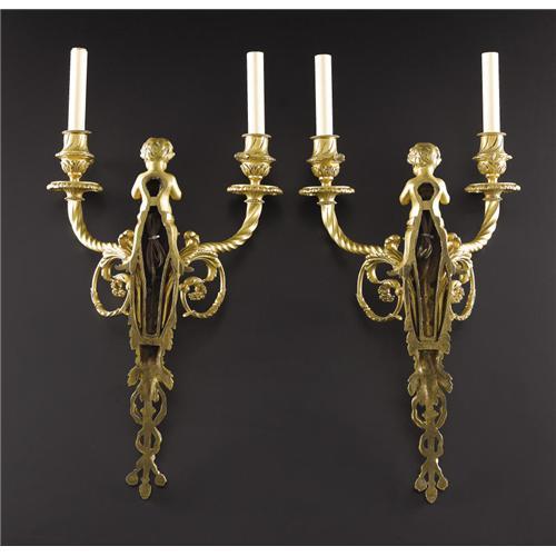 <B>A Pair of Gilt Bronze Two Light Sconces</B></I><BR><BR>Unknown maker, Continental<BR>Twentieth century<BR>Gilt bronze<BR>Unmarked<BR>17 inches long (backplate; 20 inches long (bronze)<BR><BR>The backplate cast as a flute-playing cherub term issuing two scrolled candle arms, cast with leaf and ribbon.<BR><BR> <B>Condition Report:</B> Cherubs lacking flutes.<BR><BR><b>Shipping:</b> Requires 3rd Party Shipping (<a target="_blank" href="http://www.heritageauctions.com/common/shipping.php">view shipping information</a>)