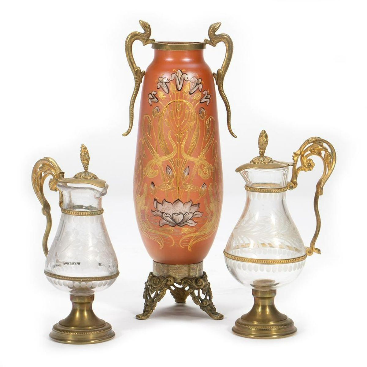 Pair of Gilt-metal and Etched Glass Pitchers, with a Pink Glass Vase