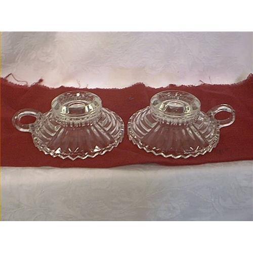 Glass candle holder in a beautiful pattern. The handles are designed with a finger grip. The candle holders measure 5 inches wide by 2.25 inches high and are in very good condition with only one tiny nick on one of the holders on the inside rim of the bottom.
