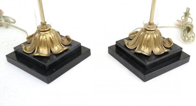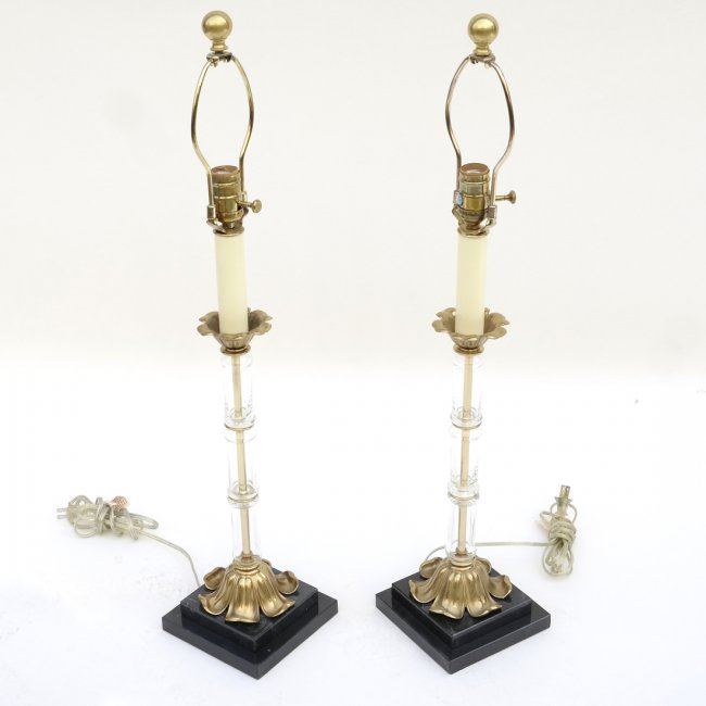 Pair of clear glass and brass column lamps. [Bases: 6" x 6", 23" H]. In good condition.