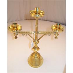 Pair of Gothic style two branch brass candelabra, each with a centre sconce on ring turned stems...