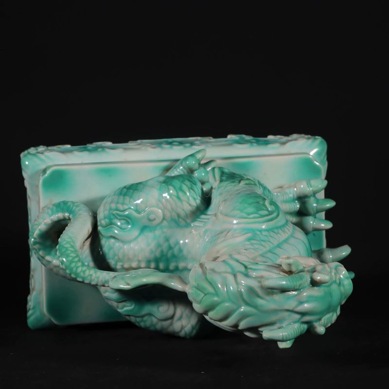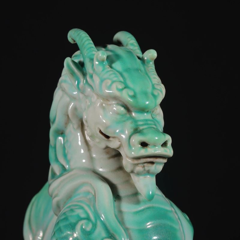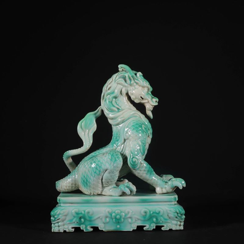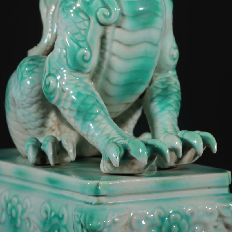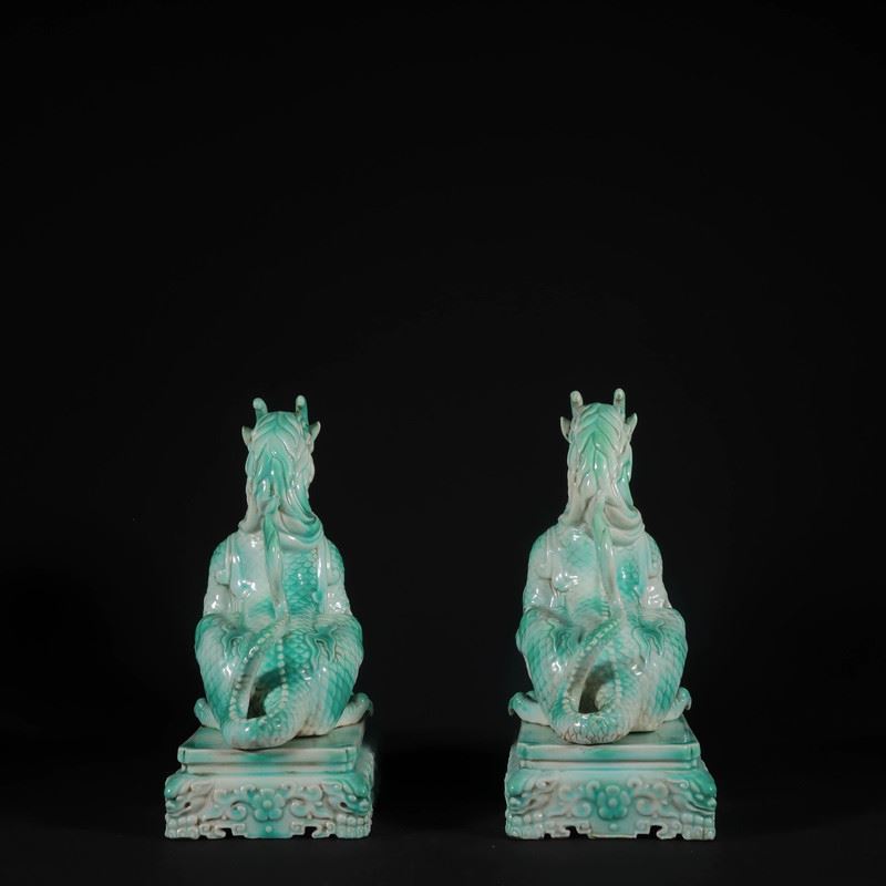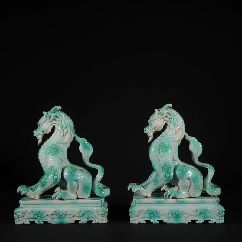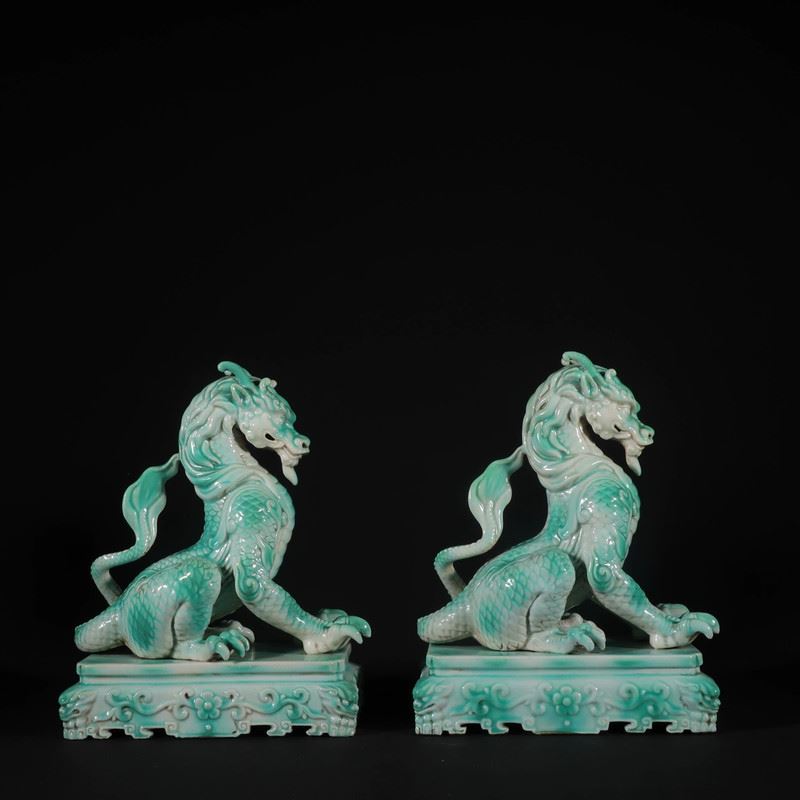 This pair of qilin figures is finely modeled in pottery and covered in a vibrant green glaze. With detailed manes, tails, and scales, the mythical beasts are depicted in a poised and powerful stance, each set on a decorative pedestal. As auspicious creatures symbolizing peace and prosperity, these qilin embody both cultural significance and artistic refinement, serving as striking decorative objects.