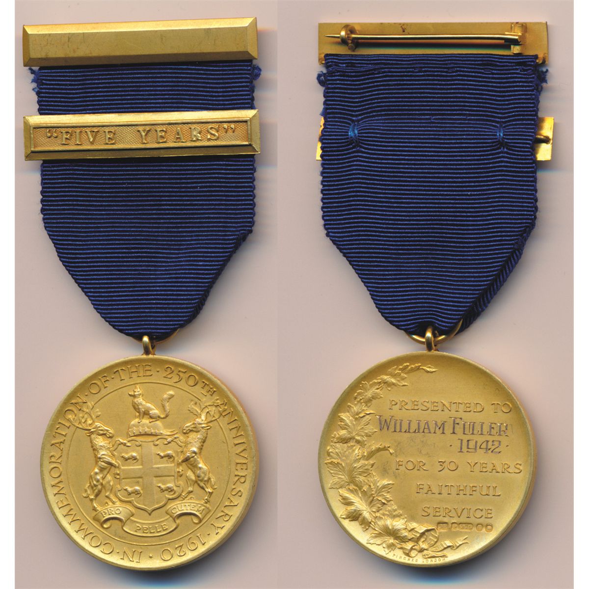 Pair of H.B.C. Long Service Medals. Presented to R.J. Summers, 1932 (See Gingras, page 21) for 15 Years of Faithful Service. Mr. Summers worked for the ‘Fur Trade Department’. Produced by John Pinches, London. 38mm. Sterling. Matte finish, with two silver ‘Five Years’ clasps, on blue ribbon. Hallmark ‘JP-lion-D’. Gingras-120. AU in brown box. (13cm x 6cm x 2cm). H.B.C. Long Service Medal. Presented to R.J. Summers, 1946 for 30 Years of Faithful Service. Produced by C. Lamond & Fils of Montreal. 38mm. 14k. gold. Matte finish. Blue ribbon. Hallmark-’14k-LF’. Gingras-120a. AU in maroon box. The plate medal in Gingras. Lot of two (2) medals.
