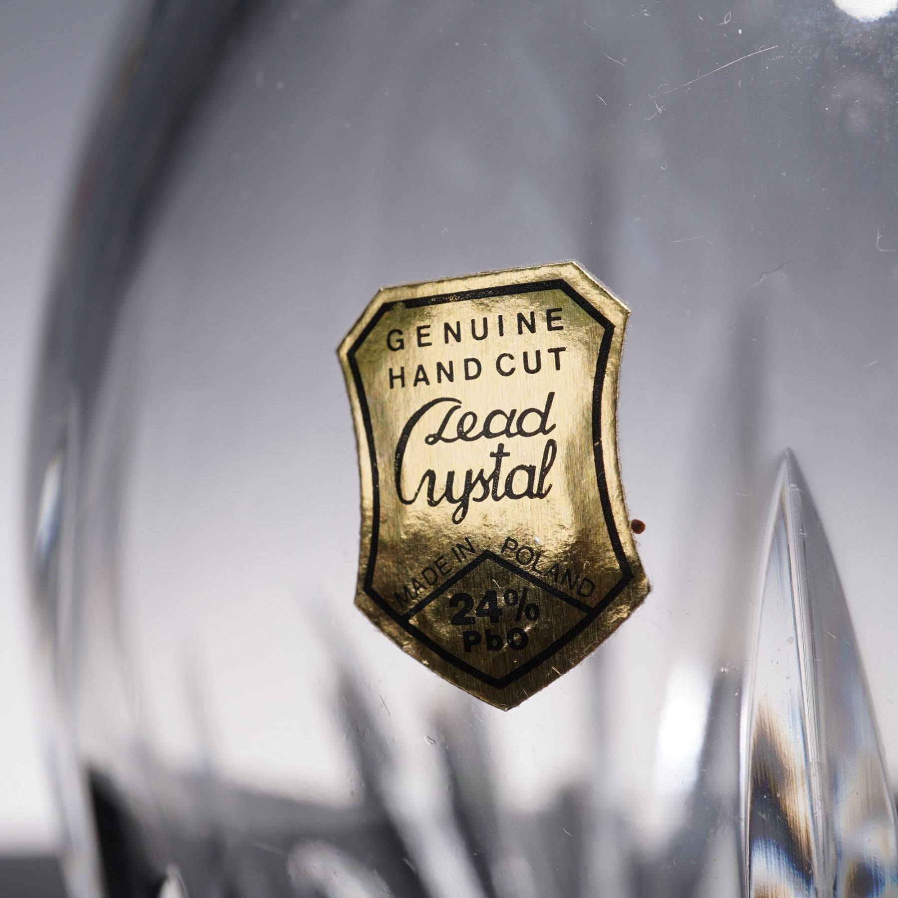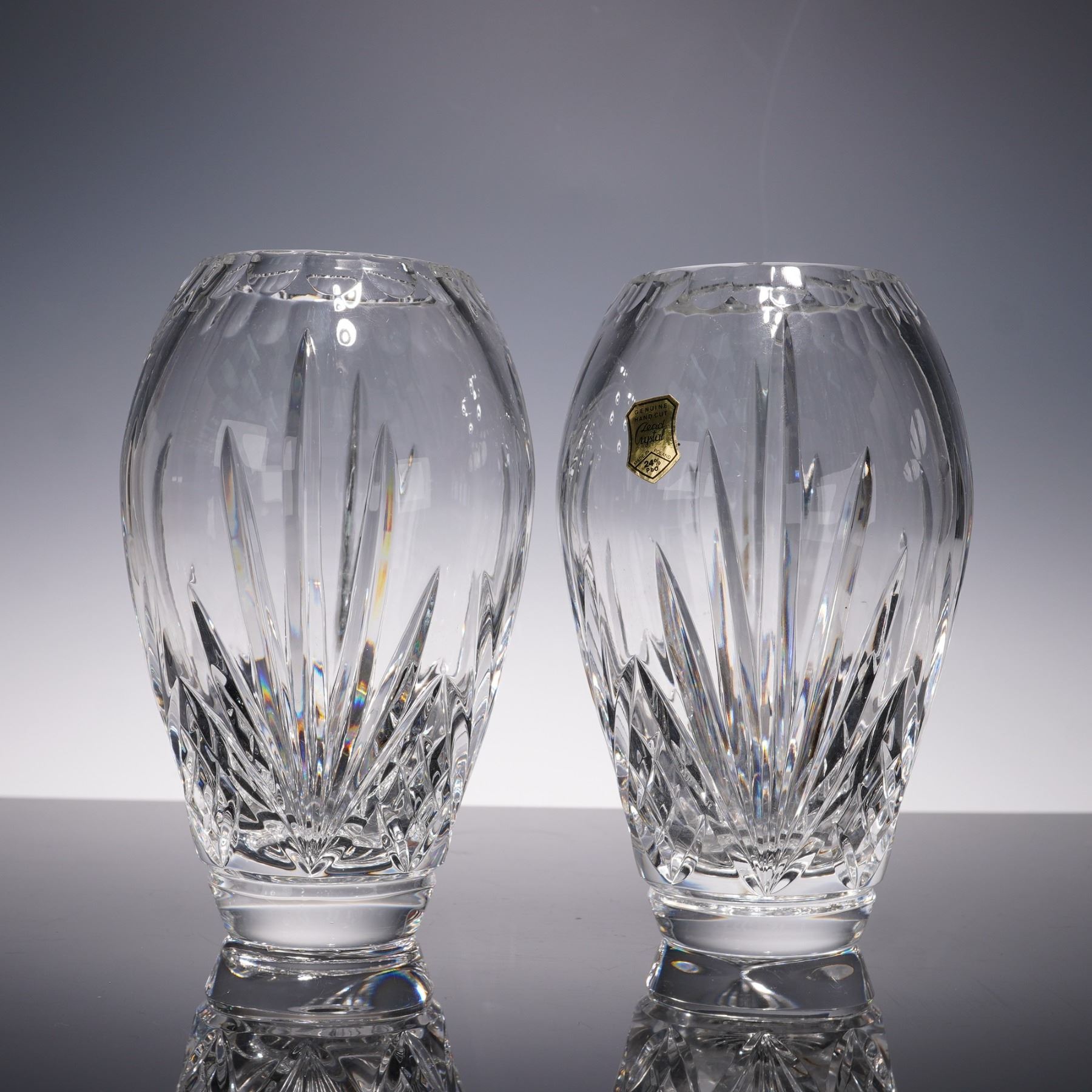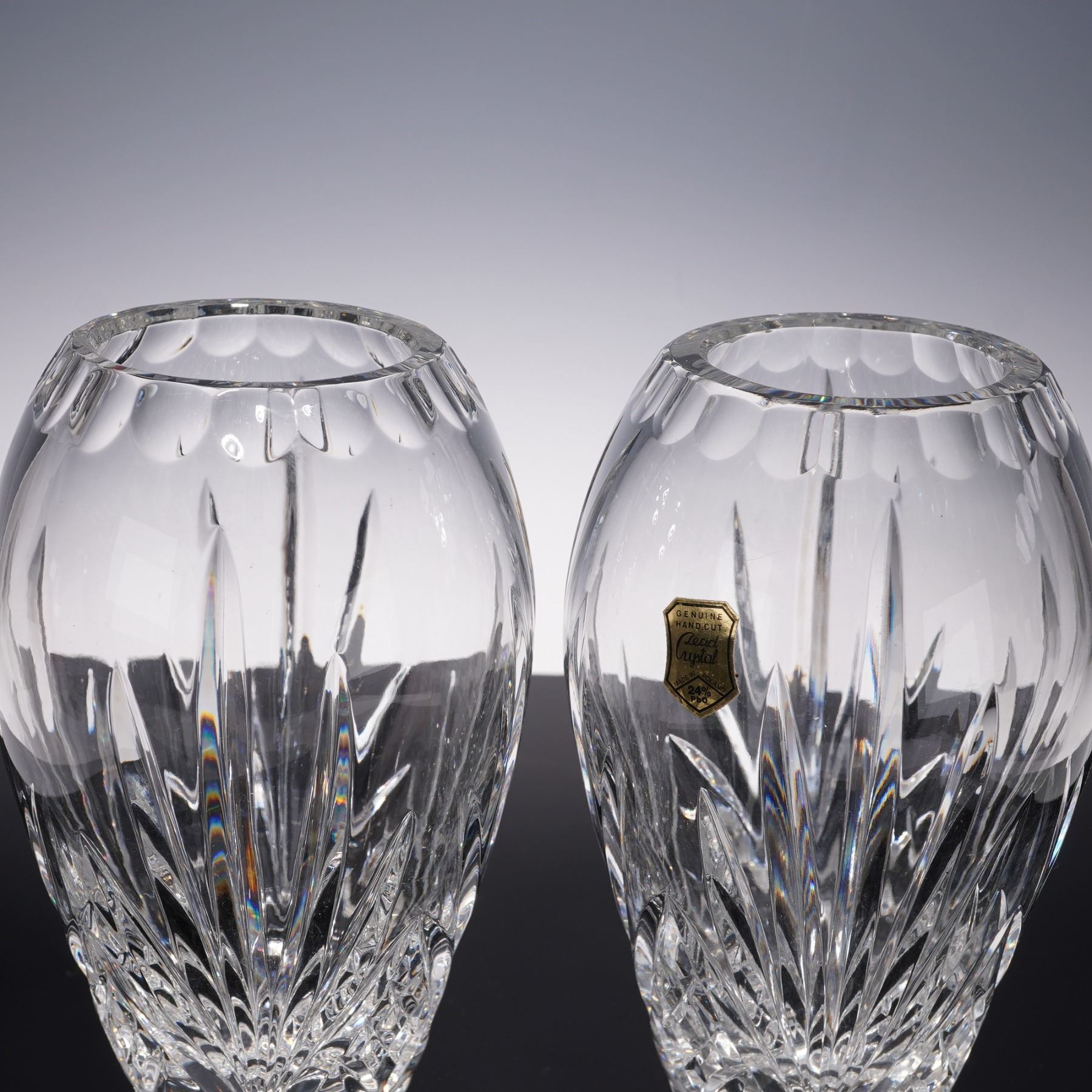 A fine pair of genuine hand cut lead crystal vases, each crafted in Poland and containing 24% PbO. These elegant pieces feature a traditional fan and crisscross motif, deeply cut into clear crystal with brilliant light refraction. The vases retain original foil labels that read "Genuine Hand Cut Lead Crystal, Made in Poland, 24% PbO." Each vase has a bulbous body tapering to a solid base, exhibiting excellent craftsmanship and clarity. Each measures 7"H.