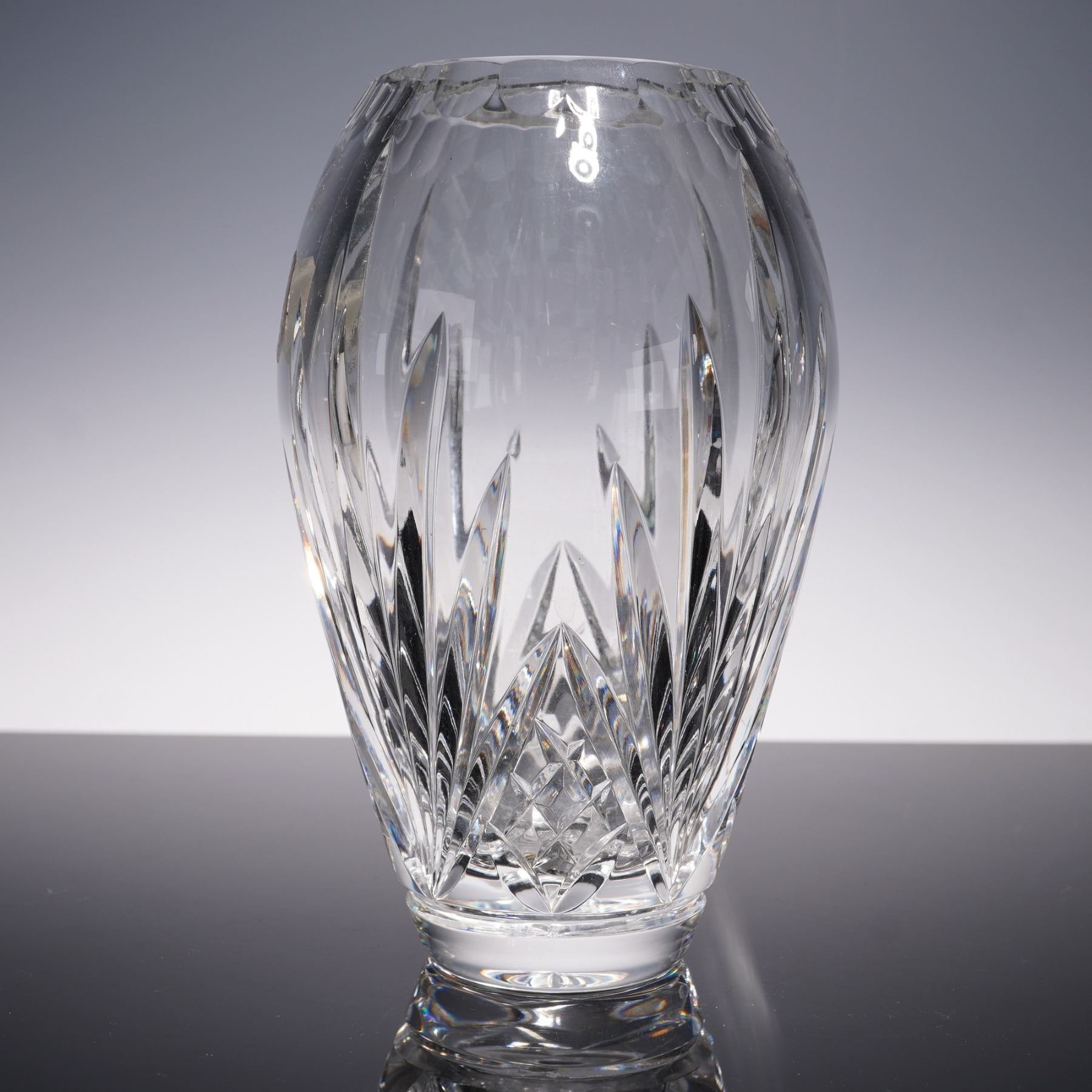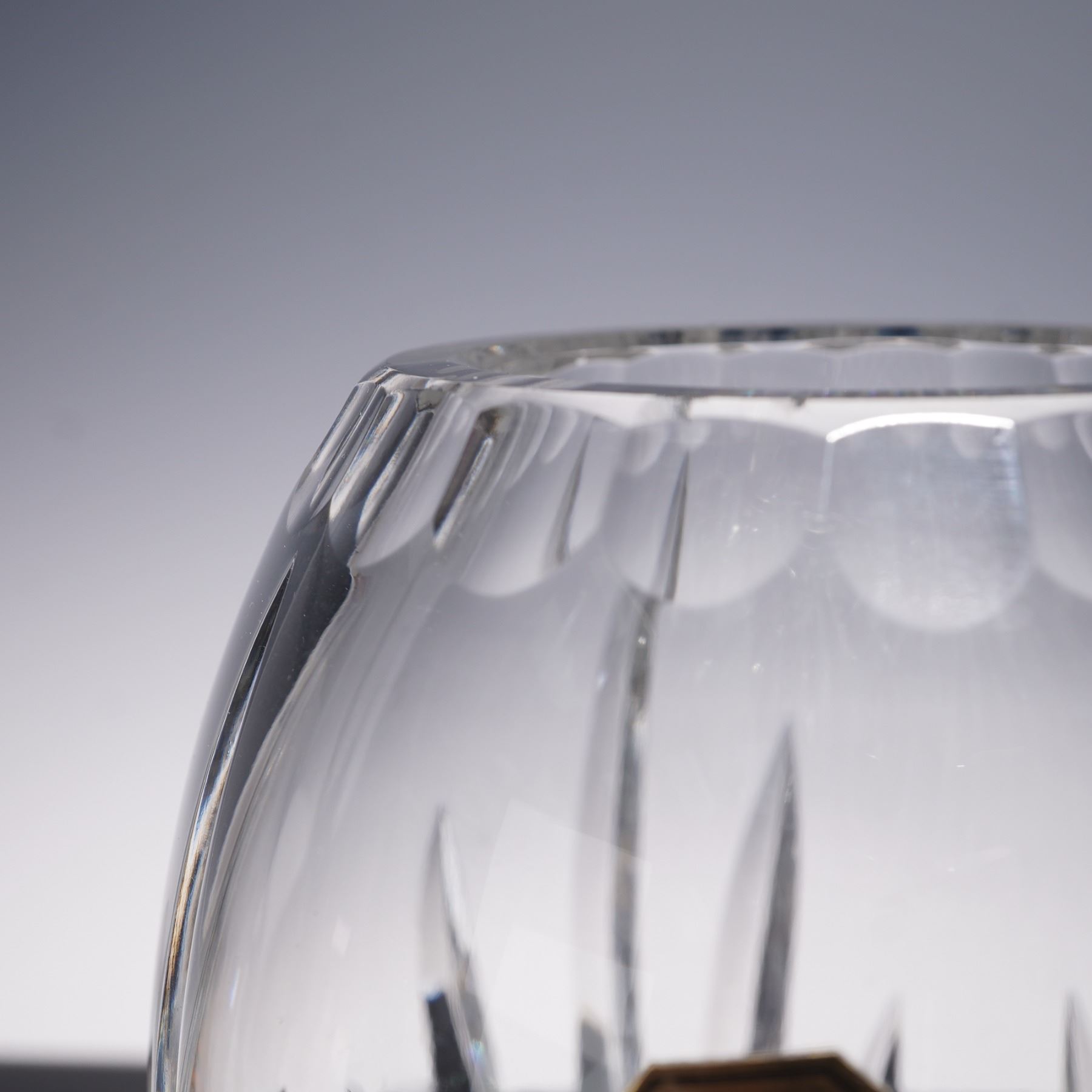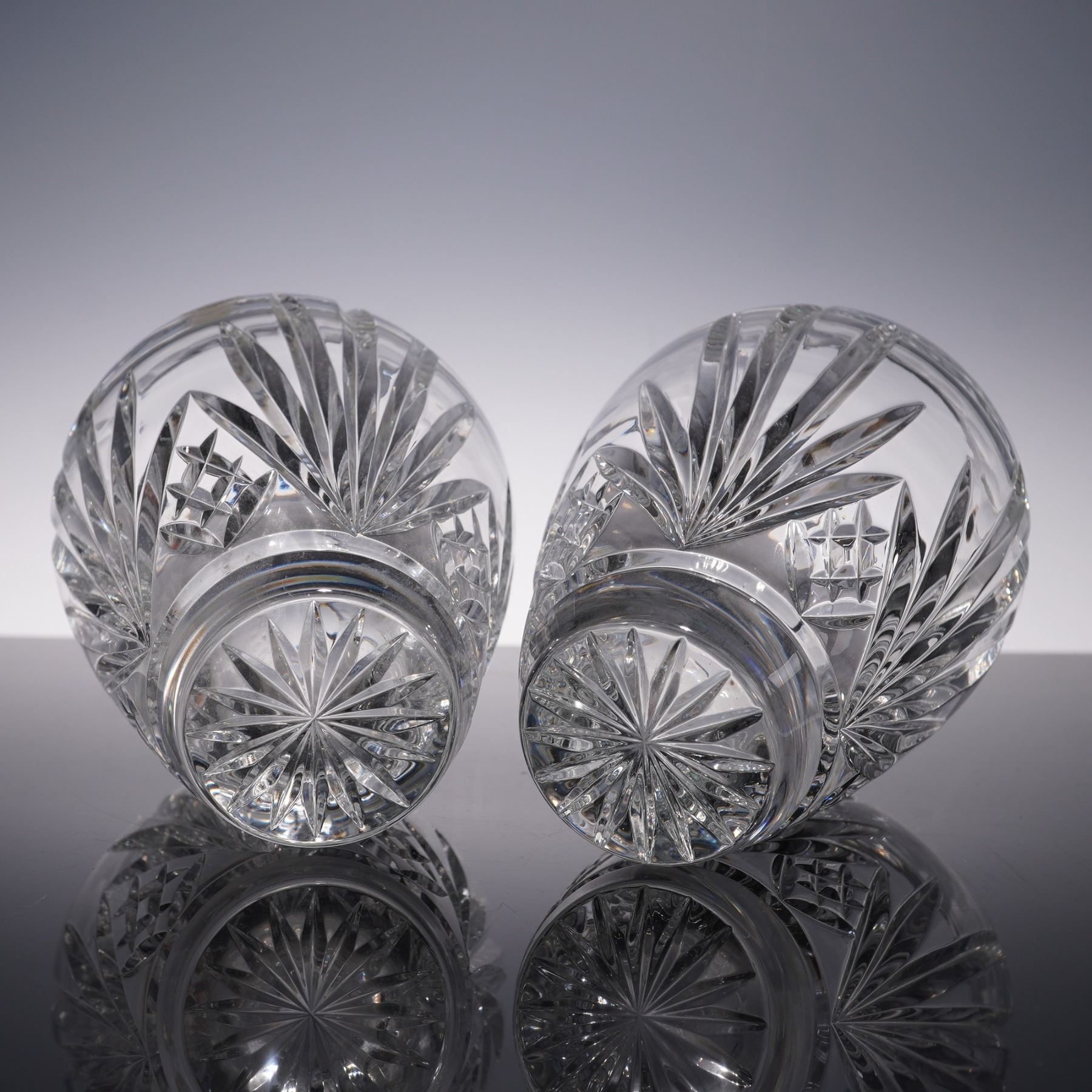 A fine pair of genuine hand cut lead crystal vases, each crafted in Poland and containing 24% PbO. These elegant pieces feature a traditional fan and crisscross motif, deeply cut into clear crystal with brilliant light refraction. The vases retain original foil labels that read "Genuine Hand Cut Lead Crystal, Made in Poland, 24% PbO." Each vase has a bulbous body tapering to a solid base, exhibiting excellent craftsmanship and clarity. Each measures 7"H.