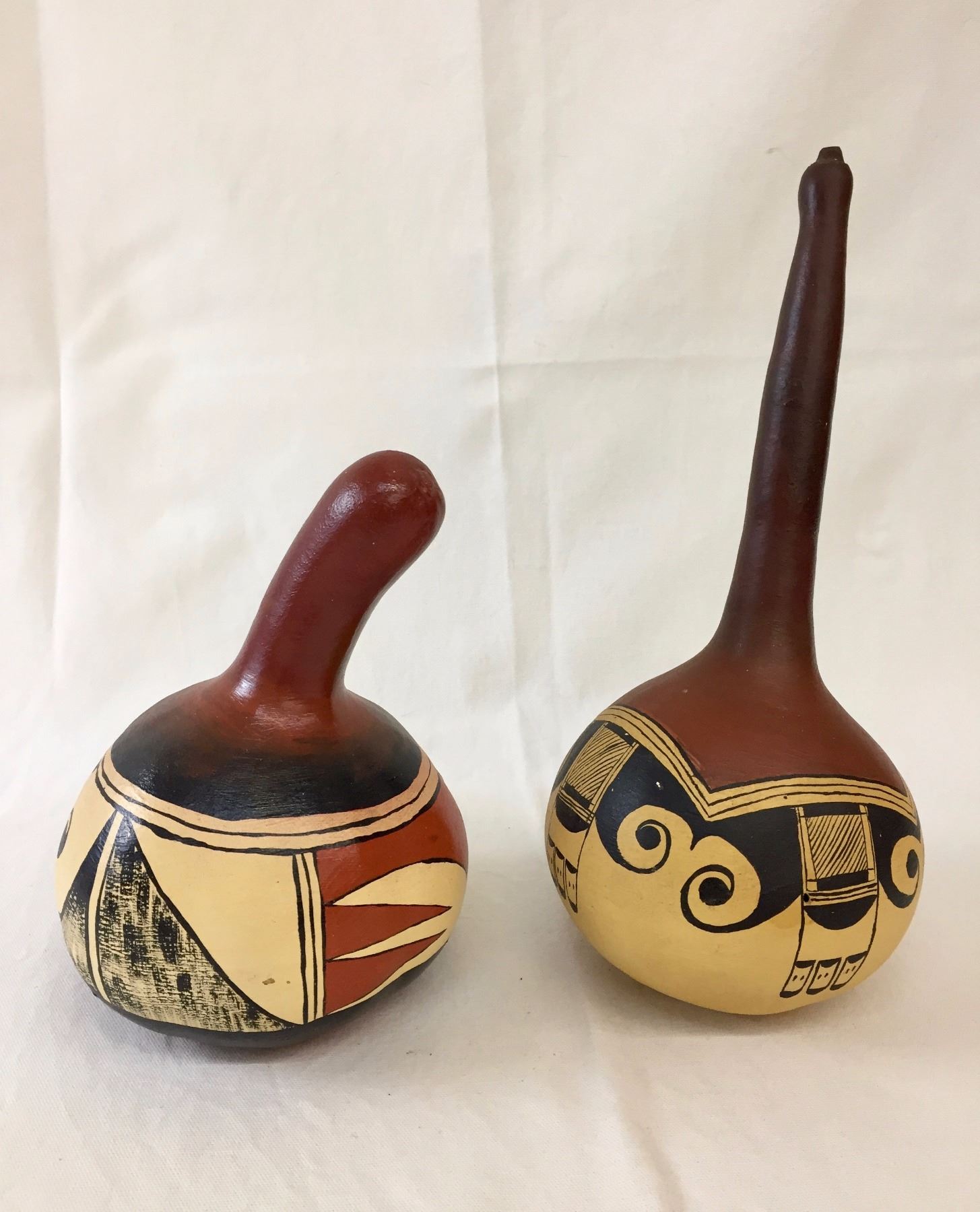 Description: Two hand-painted Apache rattles. Maker: Hallmarked, N. Wright. Approx. Age: Circa 1985. Size: 12” tall x 5” w and 8” t x 5 1/2” w. Condition: Good for their age, normal wear expected. Please look closely at the pictures - they are an important part of our description. Shipping: There will be a $7 handling / packaging fee for shipping this lot. The actual cost of postage will be added on top of that.