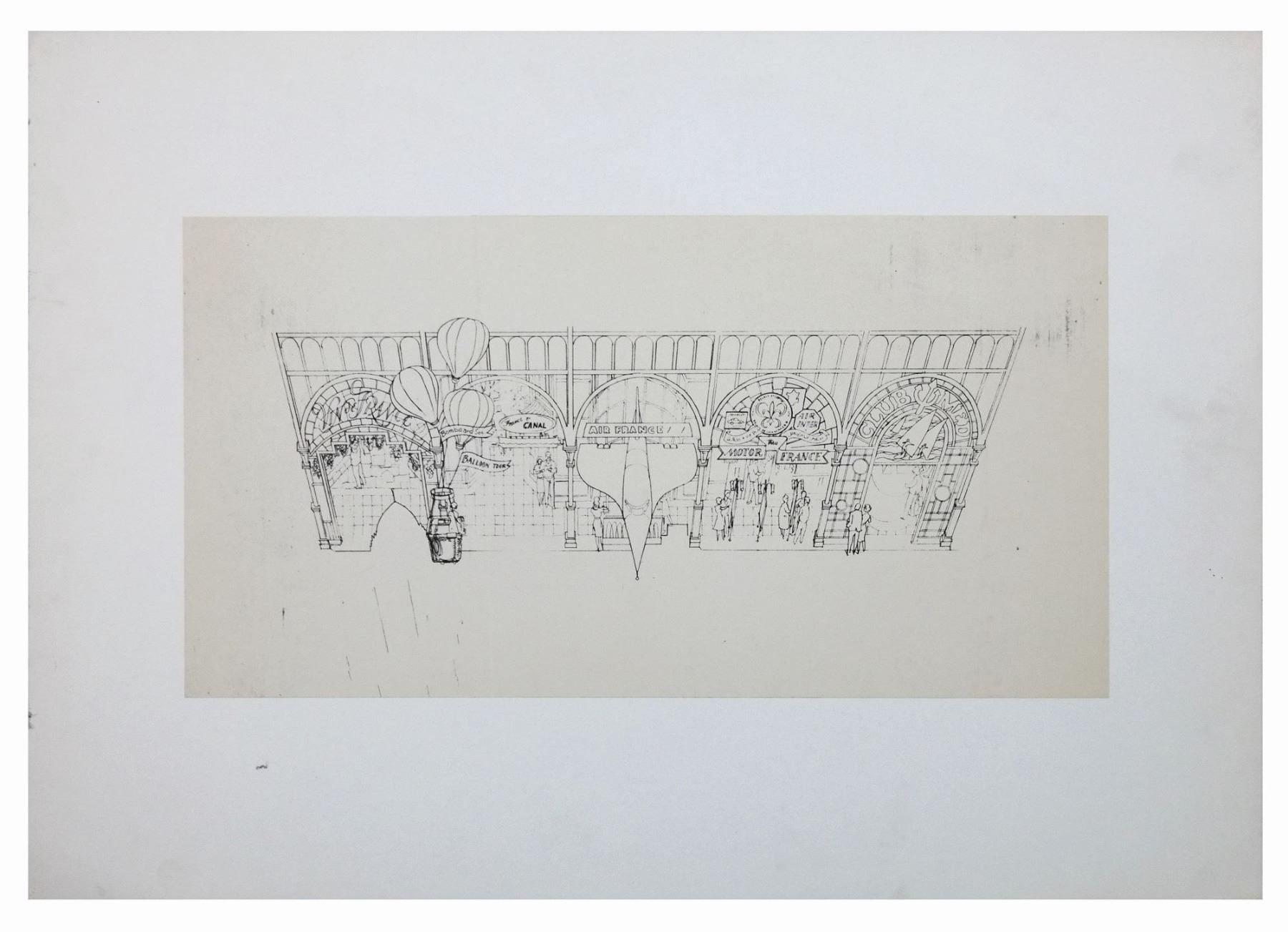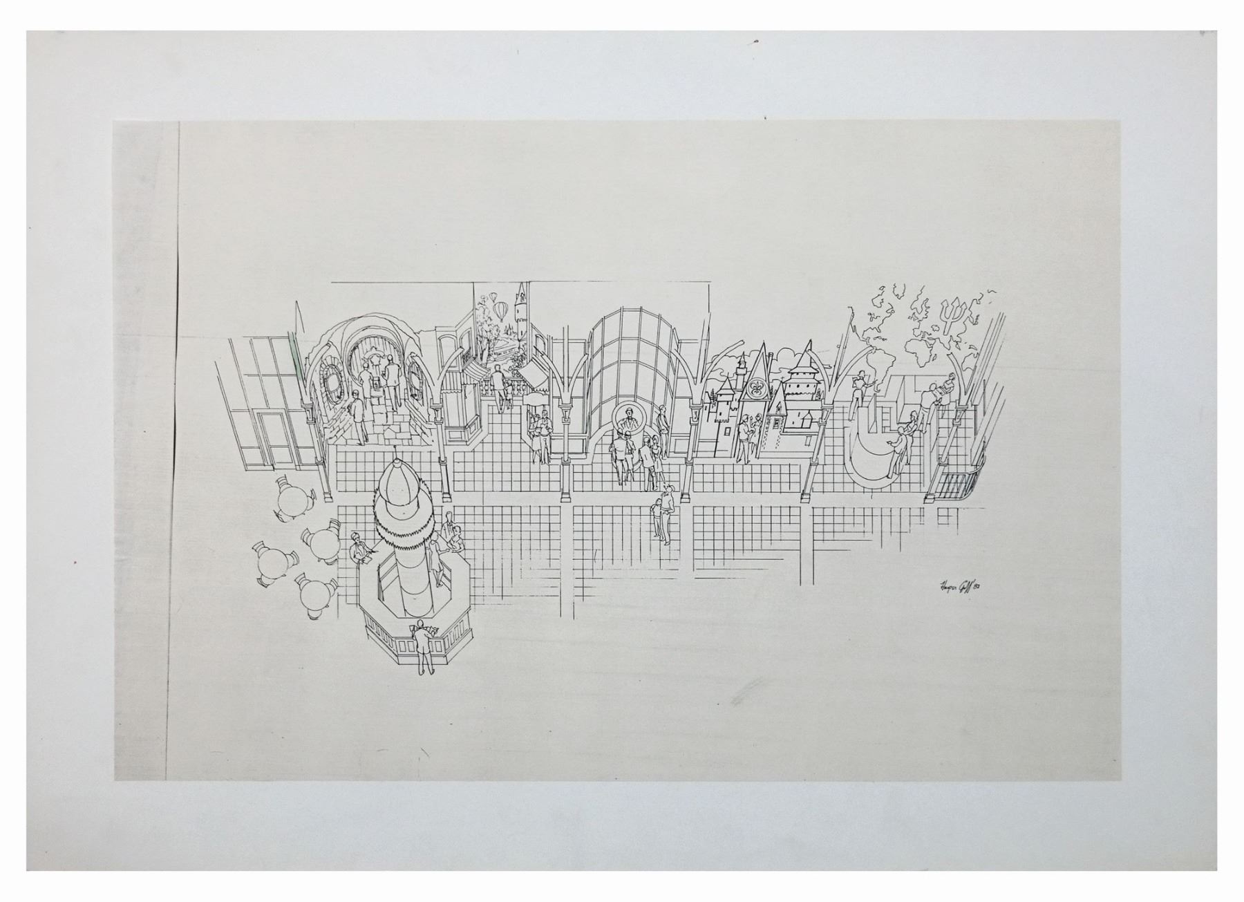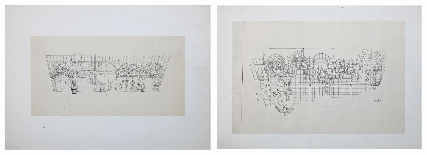 (Epcot, 1982) A pair of concept art prints by Imagineer Harper Goff for the France Pavilion at Epcot's World Showcase. Both concepts feature the same area of the pavilion with five different themed sections, but one offers a more abstract version while the other has signage placed over each themed section. Both prints are mounted on 21.25"x30" art board. The condition is very good, with spots of light scuffing to the image from age and use. The larger print is peeling away from the board slightly on the left side, and this has caused some bending.