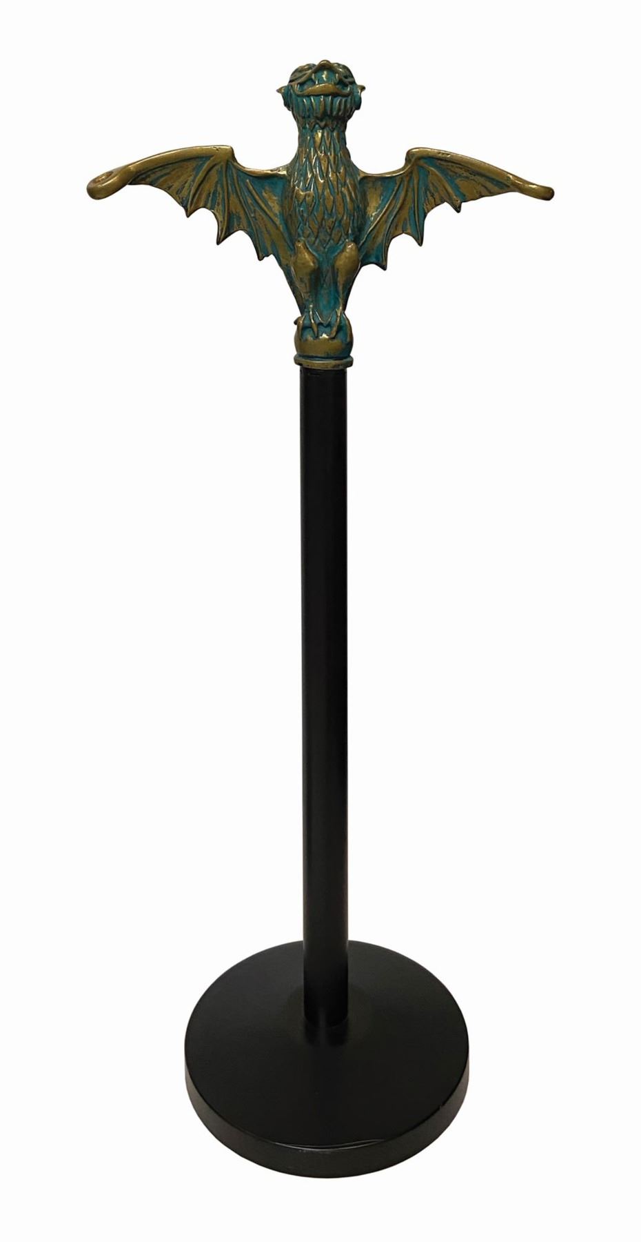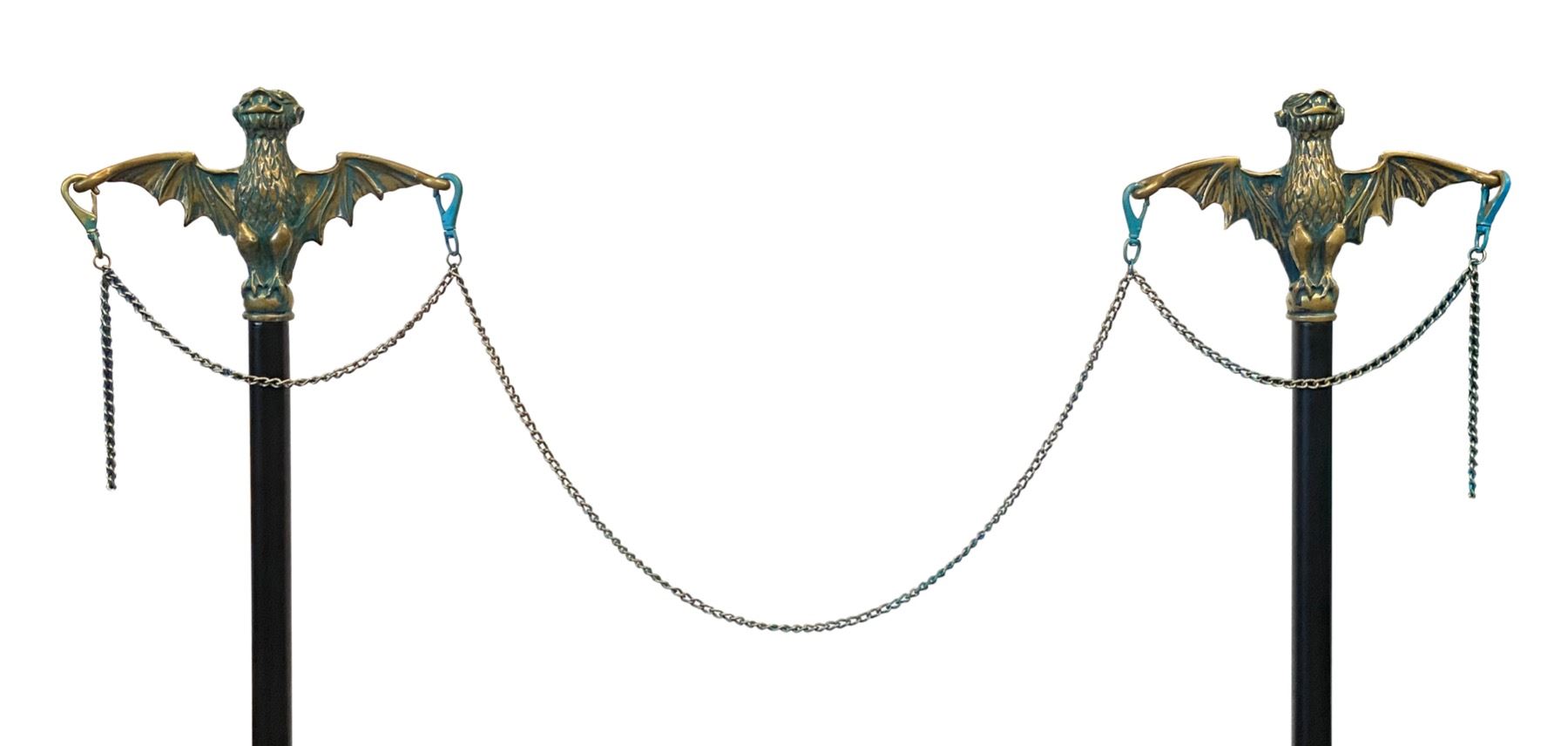 (Disneyland, c.2000s) An incredible pair of replica bat stanchions accomplished in cast aluminum with a painted brass powder-coating. These high-quality collector-made stanchions faithfully recreate the versions seen in the line-queue of Disneyland's Haunted Mansion. The stanchions measure 44" tall and are in very good condition with minor wear from use. The stanchions include lengths of chain to connect them together. Special shipping arrangements may apply. Please inquire for details and estimates.