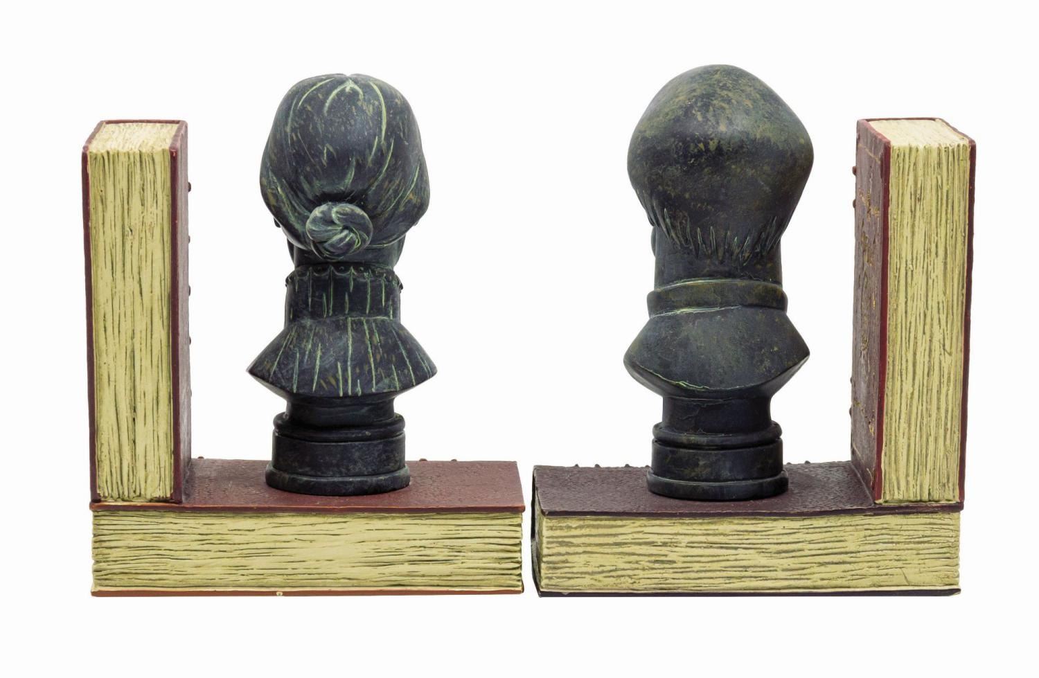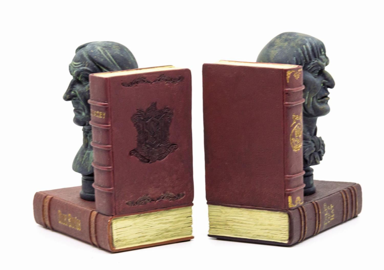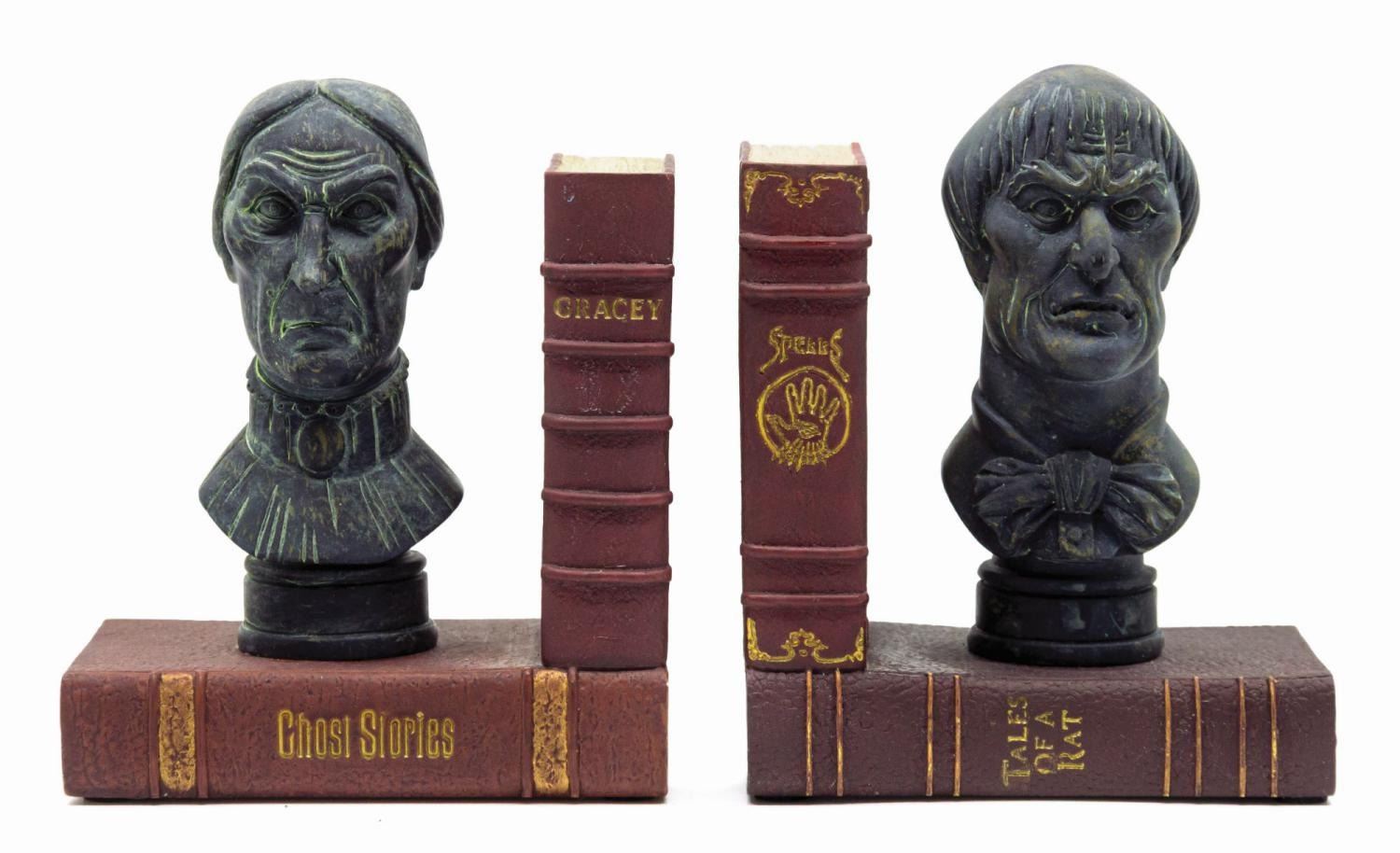 (Disneyland, c.2000s) A pair of bookends depicting the Staring Busts from Disneyland's Haunted Mansion. The cast resin bookends are exquisitely detailed to appear as if comprised of actual pebbled leather bound books and stone busts, with faux oxidation and antique patina. The feminine bust sits on a pair of books titled "Ghost Stories" and "Gracey," and the masculine bust rests on "Tales of a Rat" and next to "Spells." Measuring approximately 5.75"x4.5" and 2.75" deep, the book ends are fine condition, with minimal wear.