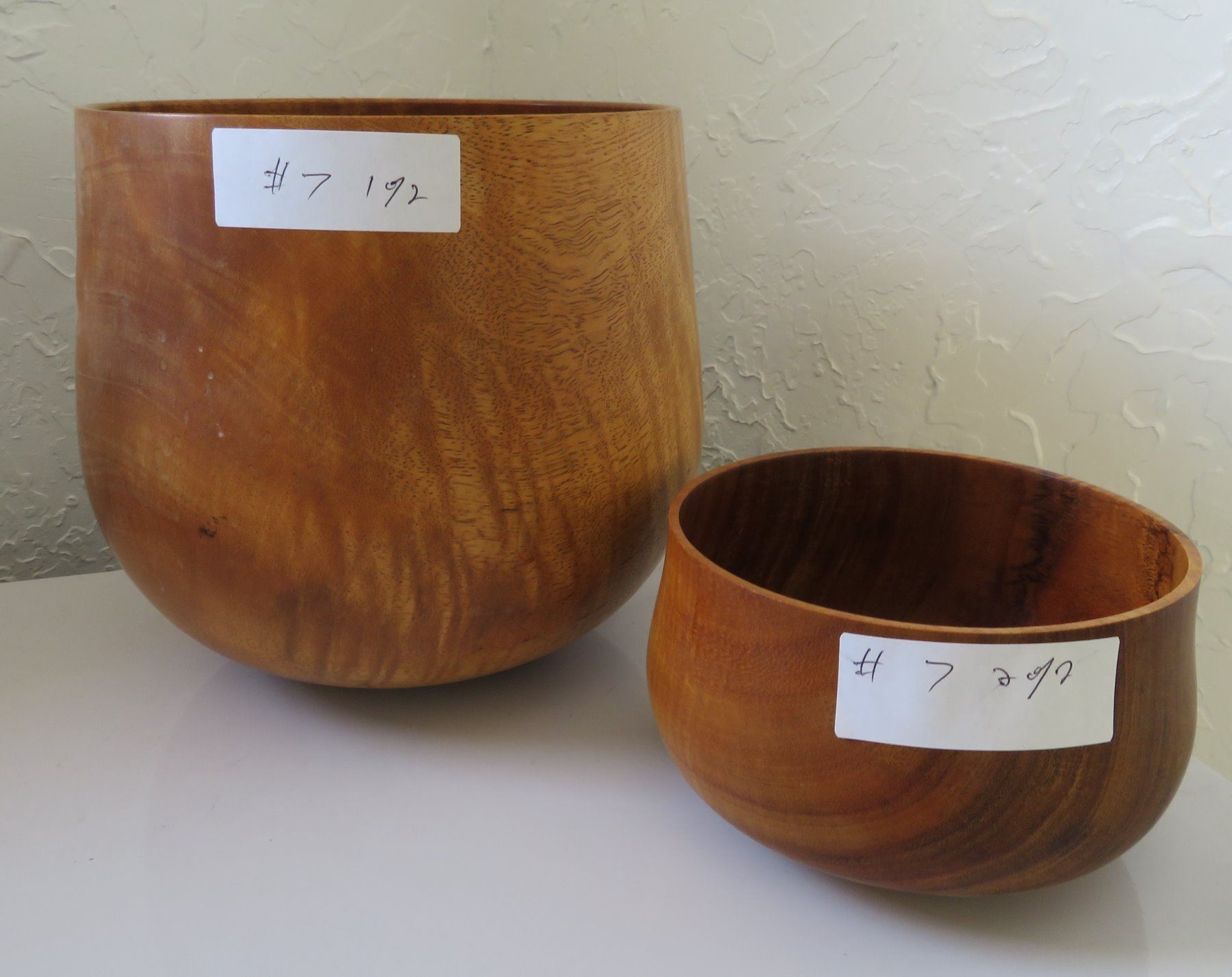Pair of Hawaiian Bowls, c. 2001. Made of possibly koa wood, the items measure 3 1/2" and 8". Hawaii, signed. Condition: Good, see images. Shipping: $25.50 w/insurance and signature, due to value.