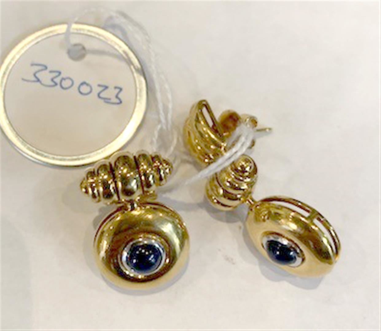Pair of Heavy 18K Gold & Sapphire Earrings containing two round cabochon sapphire weighing approximately 1.0 cts. Total weight is 29.8 gm. Estimated retail value $5,400.