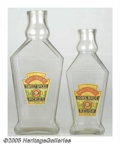 <B>Pair of Heinz Product Jars</B></I> The back of the smaller jar is embossed with the Heinz logo. Both jars have beautifully lithographed labels: one for relish and the other for pickles. The jars are 14" tall and 12 1/2" tall with no nicks or chips. Angled with this four-sided design and clear glass to show the purity of the product, these jars fit nicely into any country store display. Lot:252
