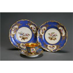 The plates polychrome decorated with bird cartouches on a French blue ground, each impressed HEREND and with blue painted mark; one impressed MF. The cup and saucer decorated with floral cartouches alternating with gilt floral sprays on a turquoise ground, the saucer with initials A.F. F.S.; each with incised beehive mark and impressed numerals. Chip to rim of saucer.