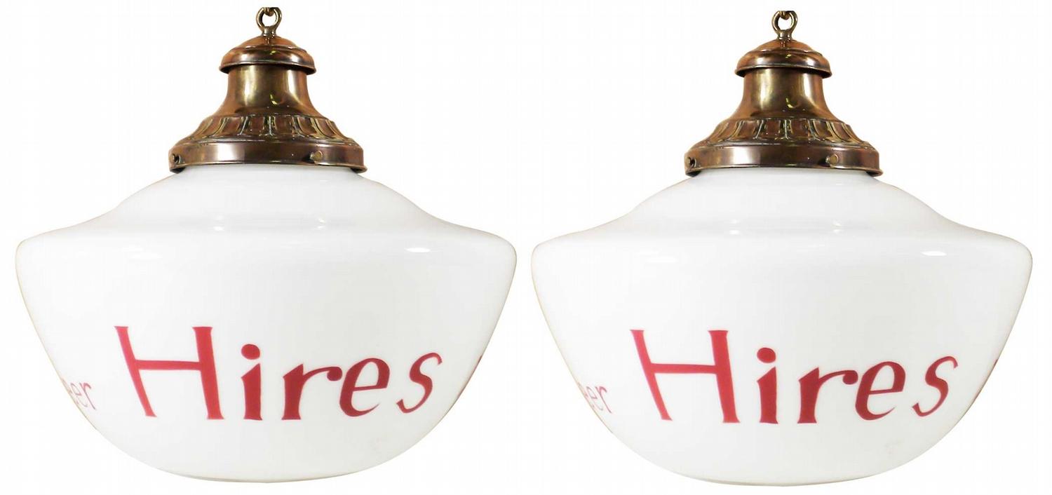Pair of Hires Root Beer Ceiling Glass Globes with original hanging fixtures. No chips or cracks, excellent condition. 15 1/2 inch diameter X 10 1/2 inches tall.