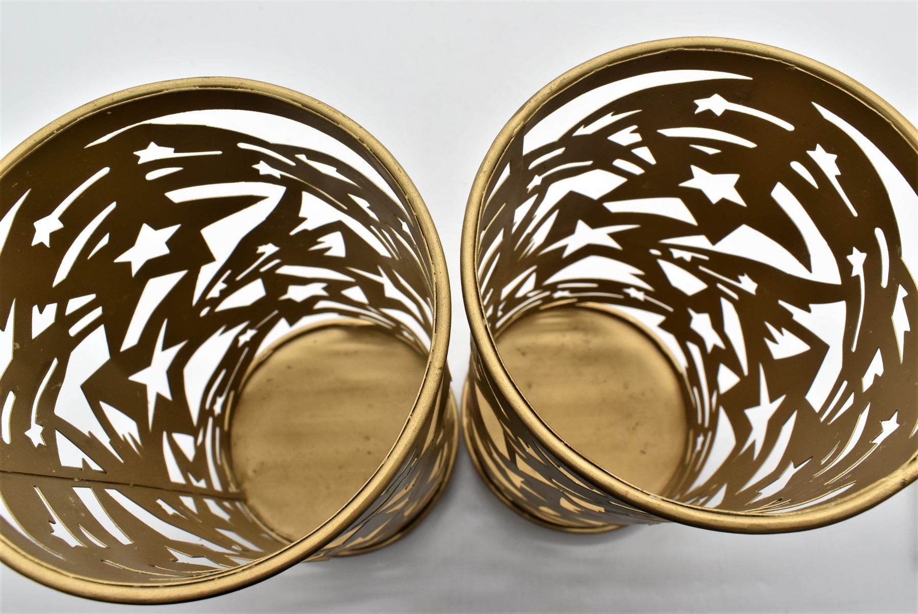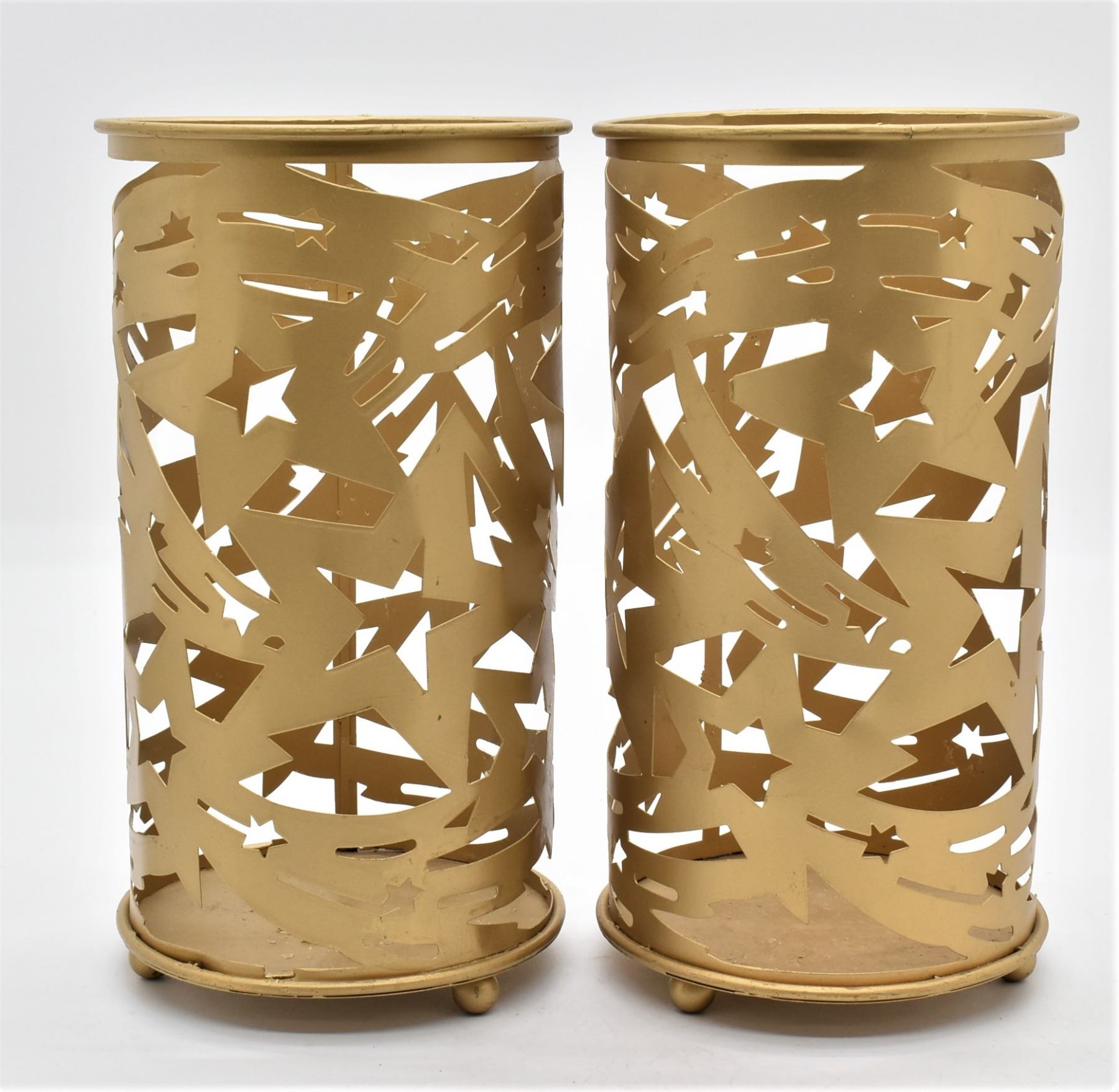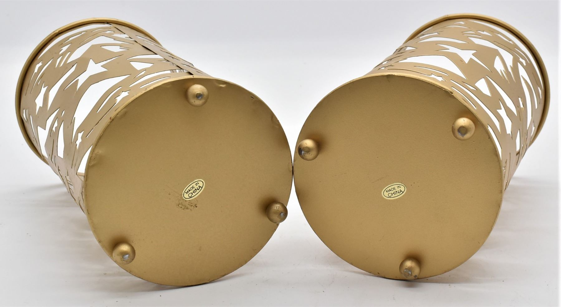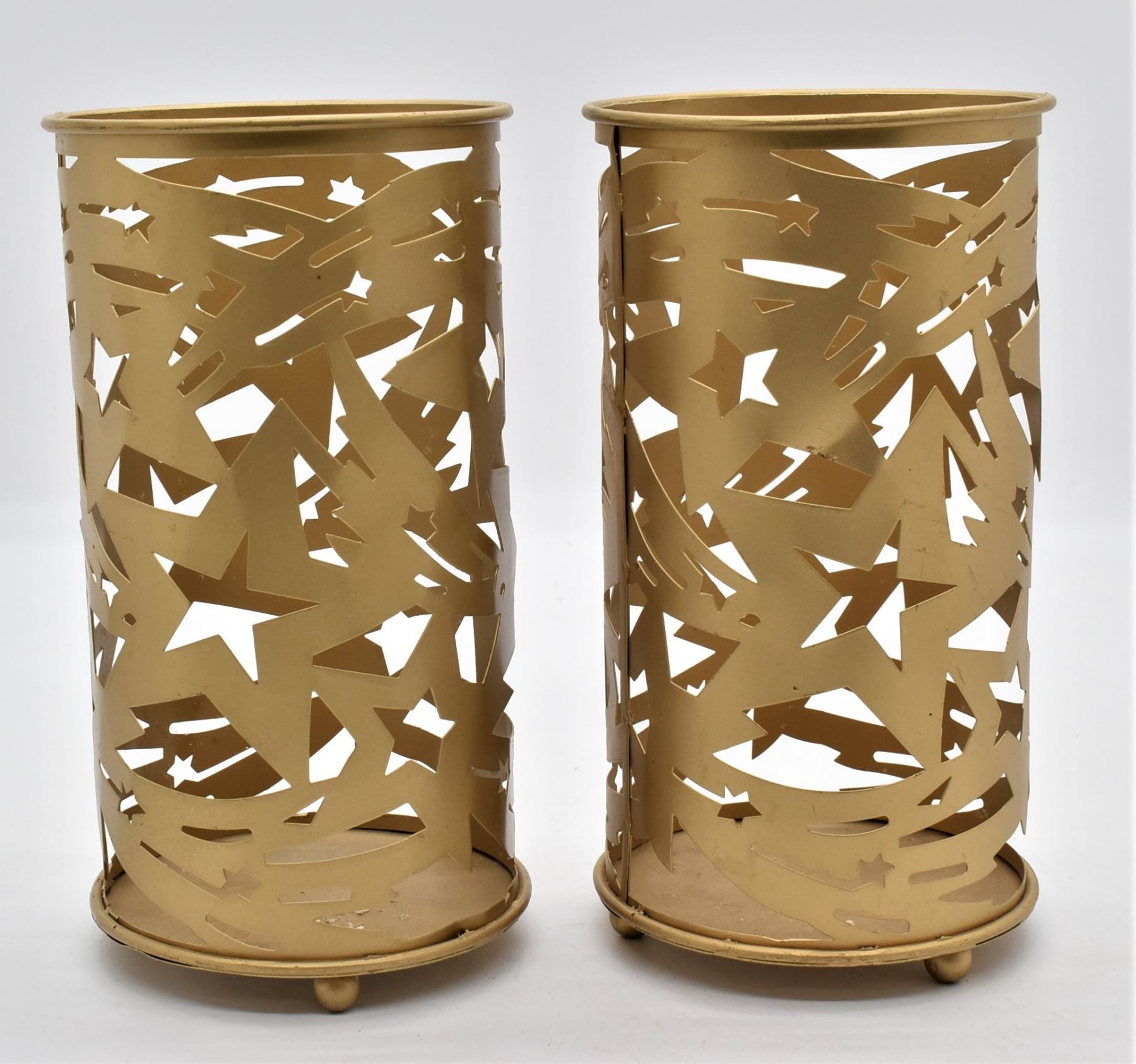 Pair of Holiday Luminarias, pierced metal holders for candles, gold in color, measures 8.5''H x 5''D, ball feet