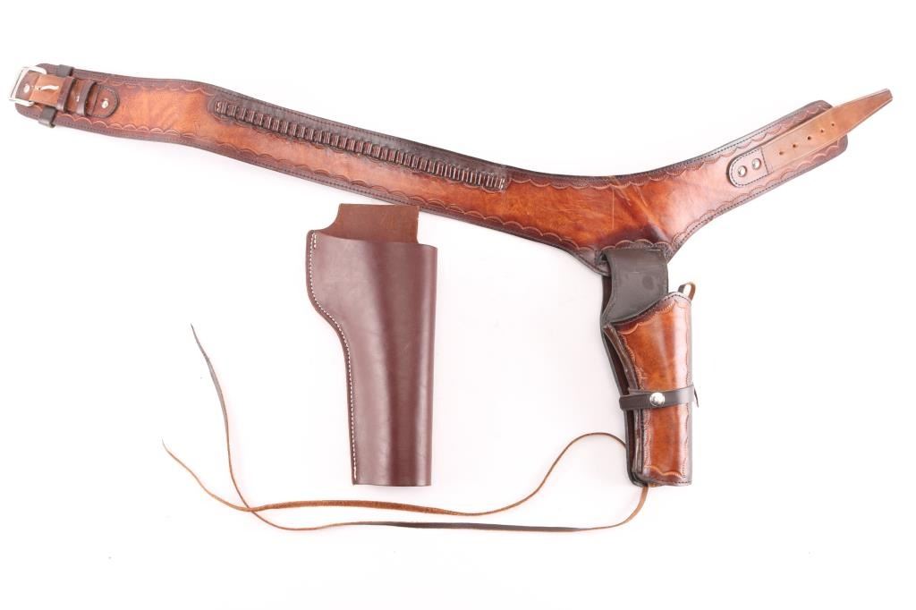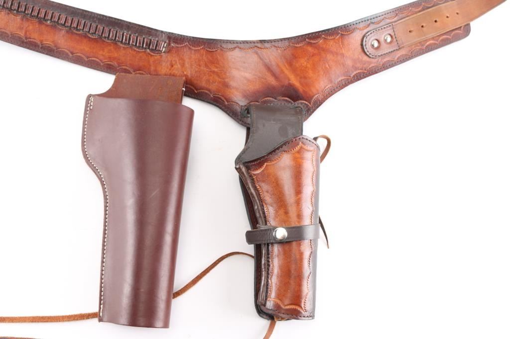 Leather holster and rig with stamp design, measures 38" around and holster is 10 1/2" in length. Additional holster is 12 1/4" in length.