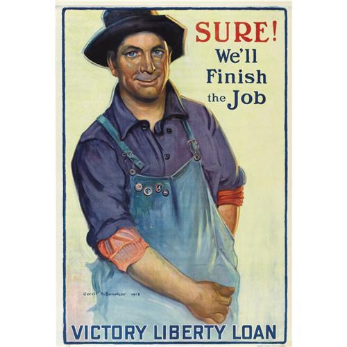 <B>Pair of "Homefront" World War I Posters.</B></I> Included are: Sure, We'll Finish the Job; 26" x 38" Artist: Gerrit A. Beneker. Issued for the fifth and final Liberty Loan, known as the Victory Liberty Loan, this image incites the populus to give one last time to finish the job overseas. The man is drawn digging deep into his pockets to complete the war effort. A common poster in extant numbers, it is a very important piece as the man is depicted with several buttons and workman's garb. It shows that the common working man helped in great quantities to support the war and ensure victory for the United States and its allies. <BR>For Home and Country; 20" x 30", Artist: Alfred Everett Orr. Most books and collectors sites describe this poster as "common." Although it may be "common" in the sense that there are more around or more were produced, it is by no means a "common" work of art. The poster is a microcosm of what the Liberty Loans stood for. This poster was issued for the fifth and final loan and represents the family for which all the soldiers were fighting. The home front is represented by the mother and child and the war front is depicted by the presence of the helmet and uniformed soldier. This is a masterful juxtaposition of peace and war. <BR><BR>Condition: Sure We'll Finish the Job - Extra Fine -one small stain on lower right corner; linen backed. <BR><BR>For Home and Country: Fine - repairs of several tears visible on lower edge; upper left corner also repaired and stained; linen backed.