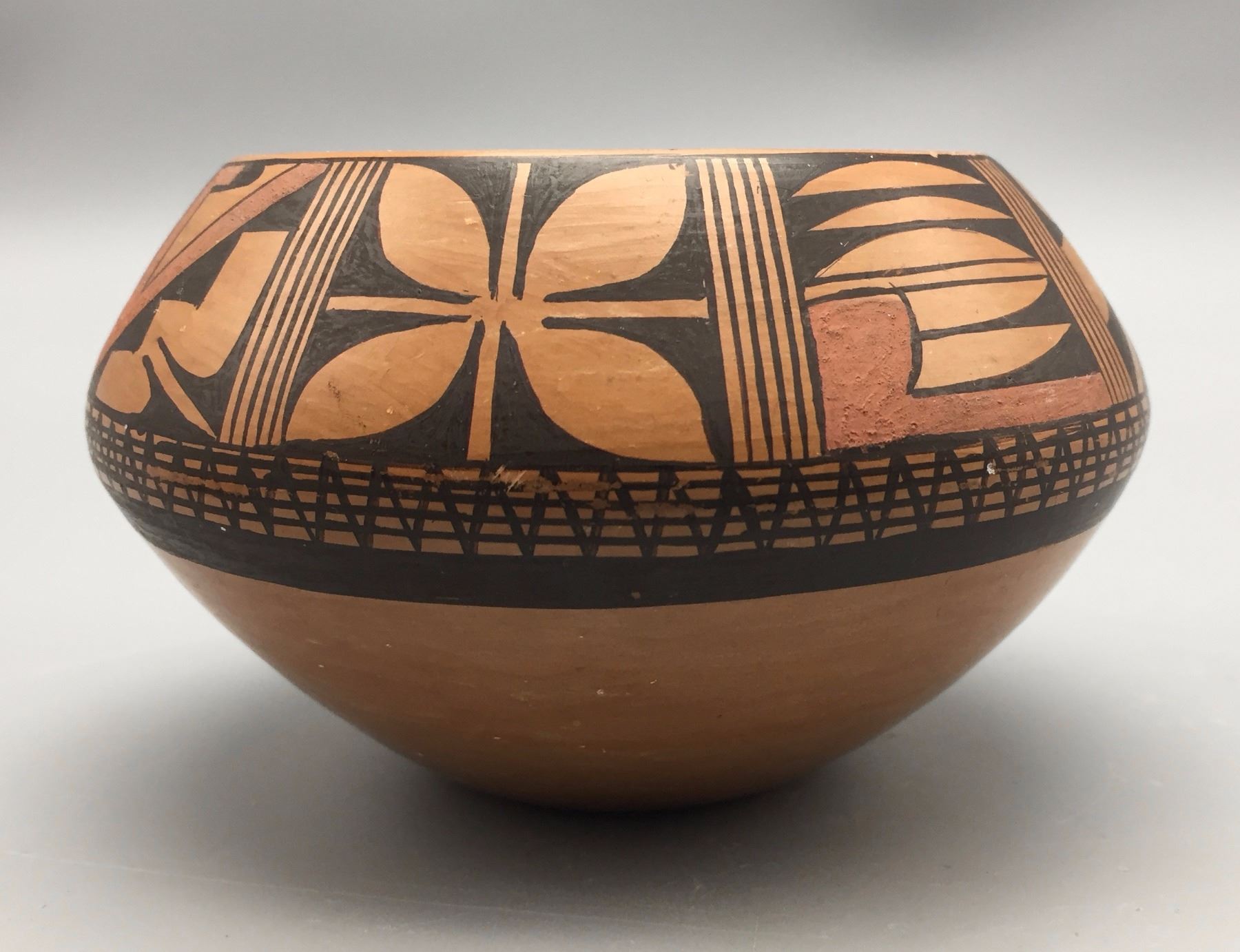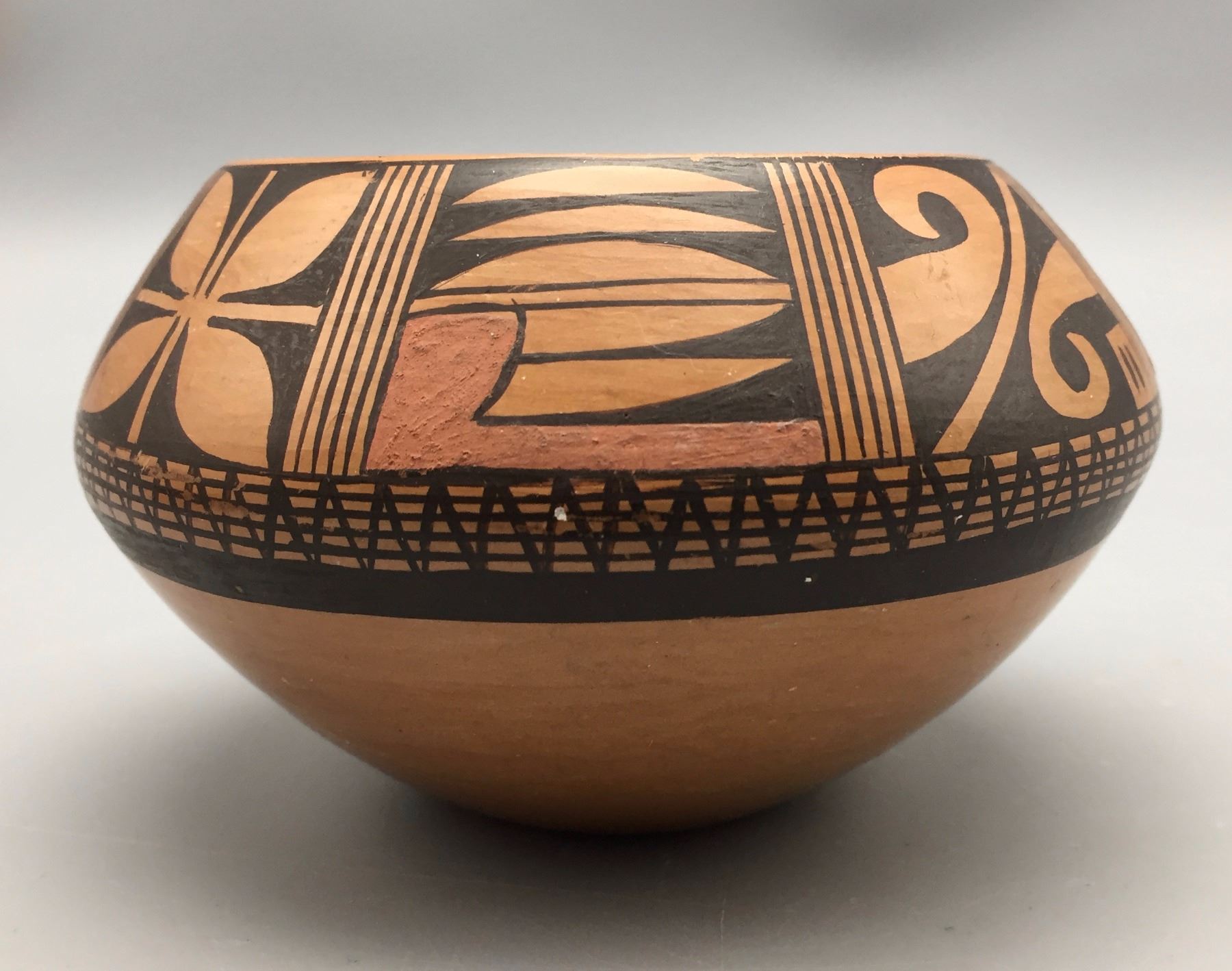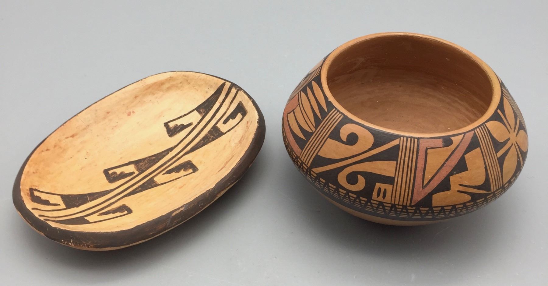 Maker: One is signed Dewakuku, Tewa, Hopi. Approx. Age: Vintage. Size: 1) 4 1/4” w x 2 3/4” h. 2) 3 1/2” w x 4 1/4” l x 1” d. Additional Info: Pair of handmade/hand-painted Hopi pots. Condition: Good for their age, normal wear expected. Please look closely at the pictures - they are an important part of our description. Shipping: There will be a $8 handling / packaging fee for shipping this lot. The actual cost of postage will be added on top of that.