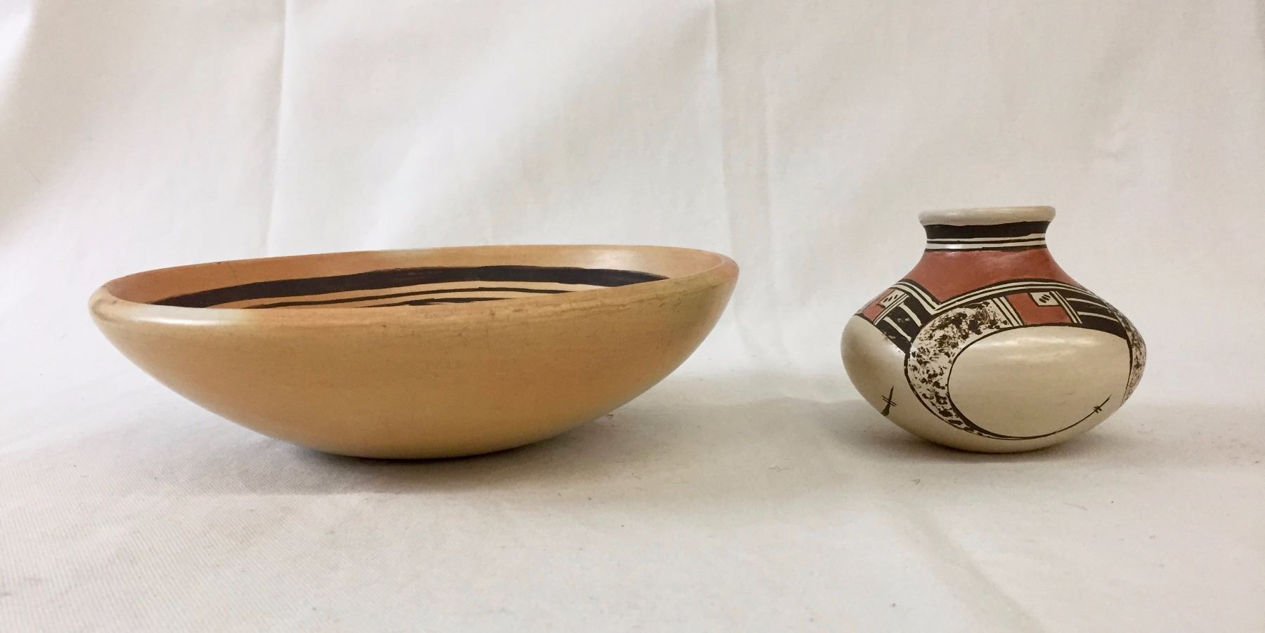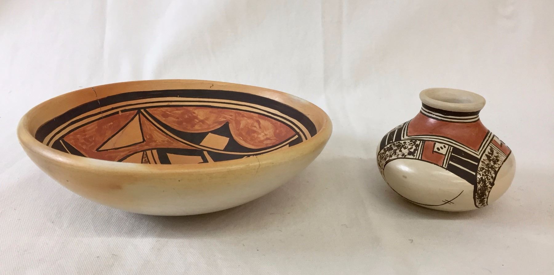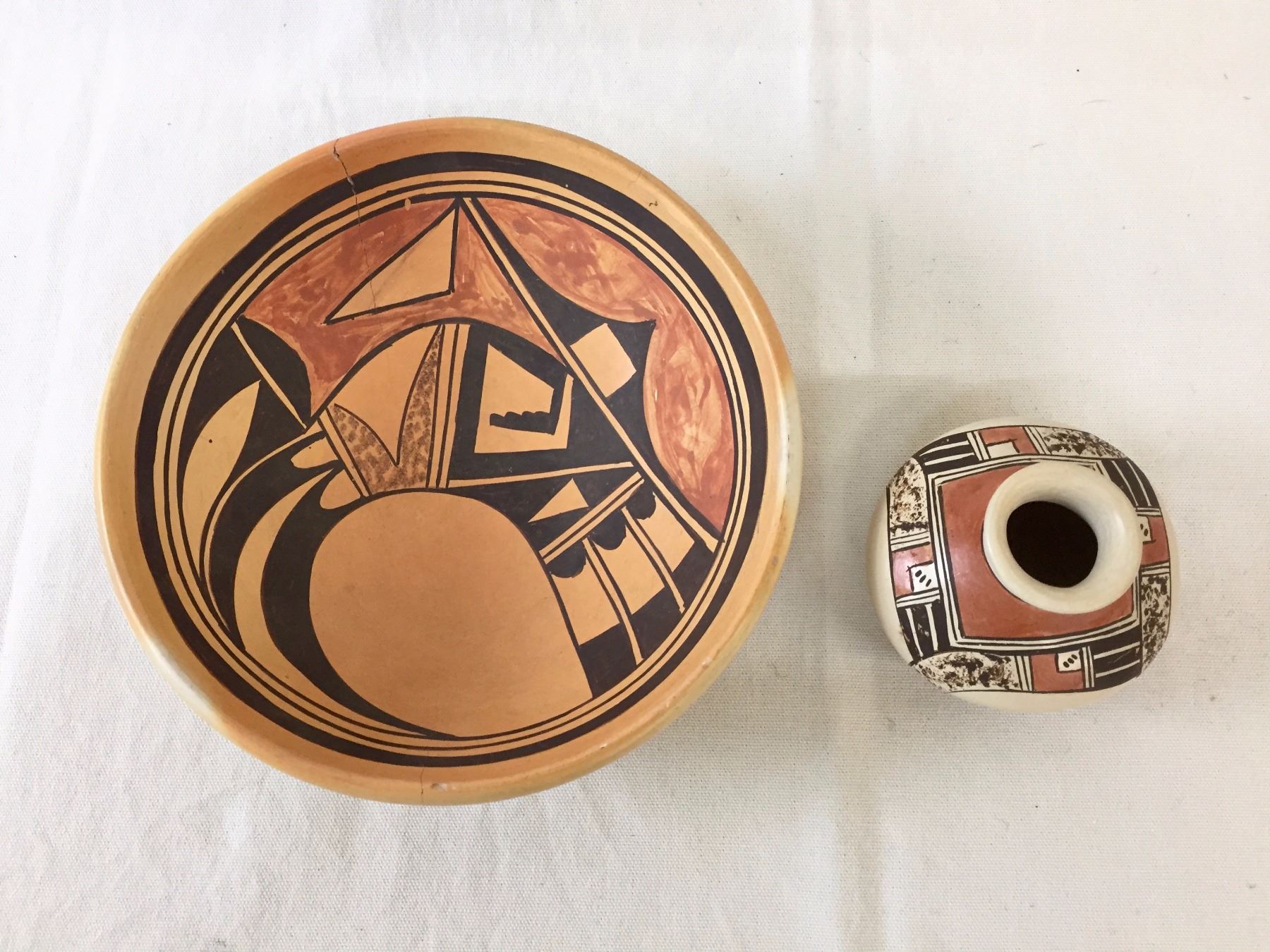 Description: Pair of Hopi pots. Maker: Various Hopi potters. Approx. Age: Vintage. Size: pots measure 2 1/2” deep x 8” wide and 3” deep x 3” wide. Condition: Good for their age, normal wear expected. Please look closely at the pictures - they are an important part of our description. Shipping: There will be a $10 handling / packaging fee for shipping this lot. The actual cost of postage will be added on top of that.