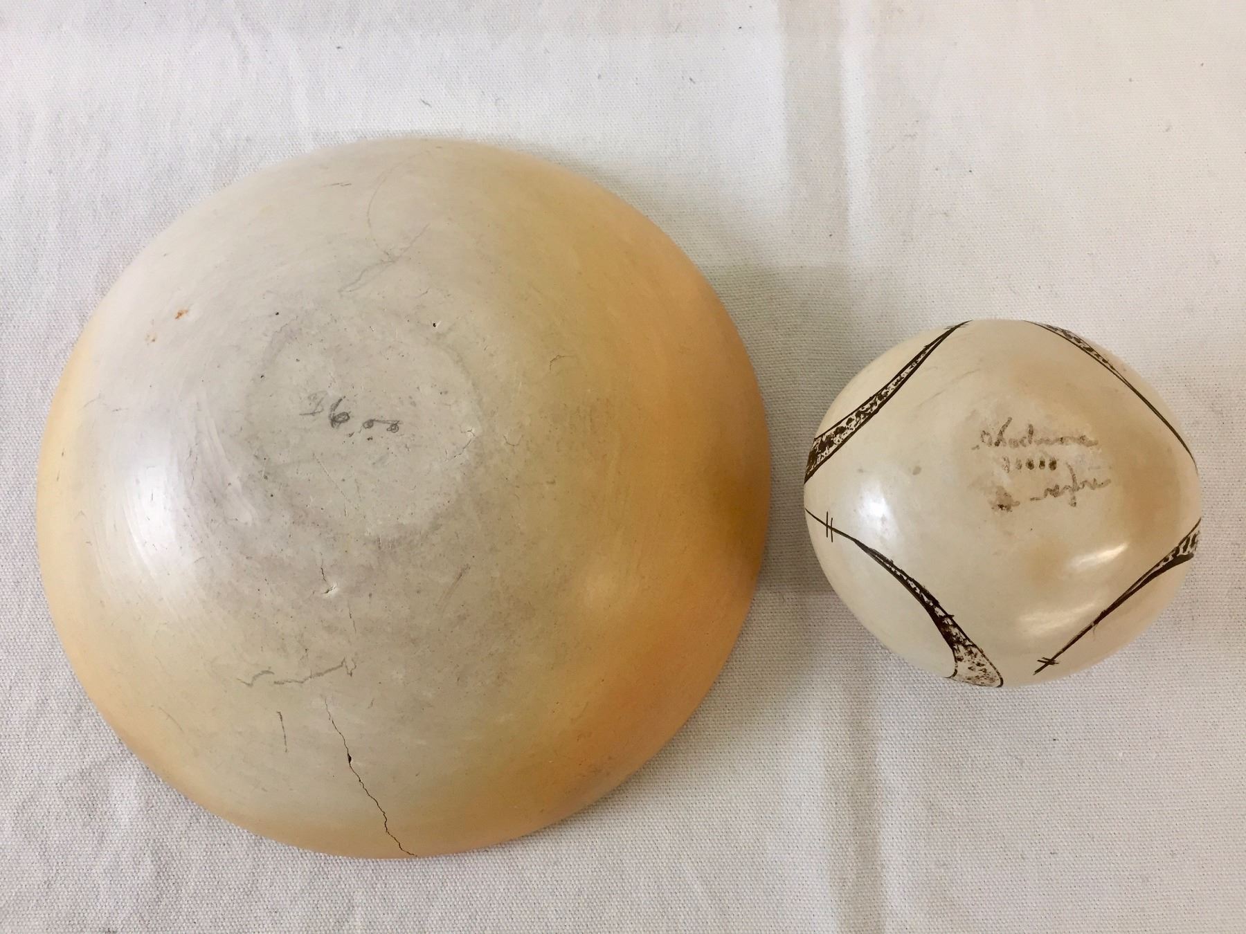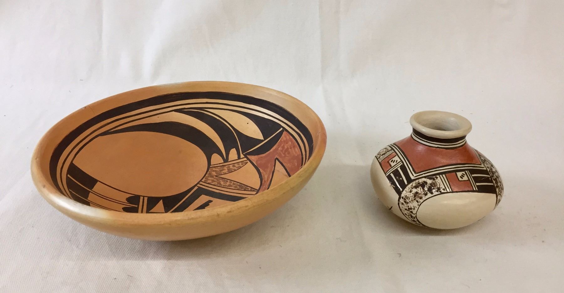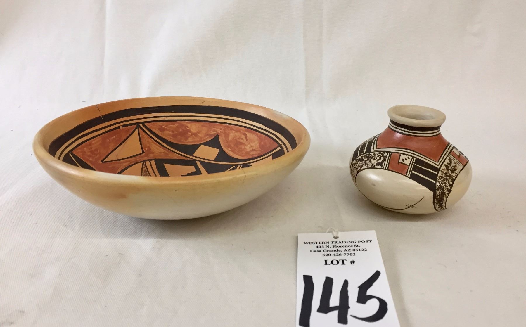 Description: Pair of Hopi pots. Maker: Various Hopi potters. Approx. Age: Vintage. Size: pots measure 2 1/2” deep x 8” wide and 3” deep x 3” wide. Condition: Good for their age, normal wear expected. Please look closely at the pictures - they are an important part of our description. Shipping: There will be a $10 handling / packaging fee for shipping this lot. The actual cost of postage will be added on top of that.