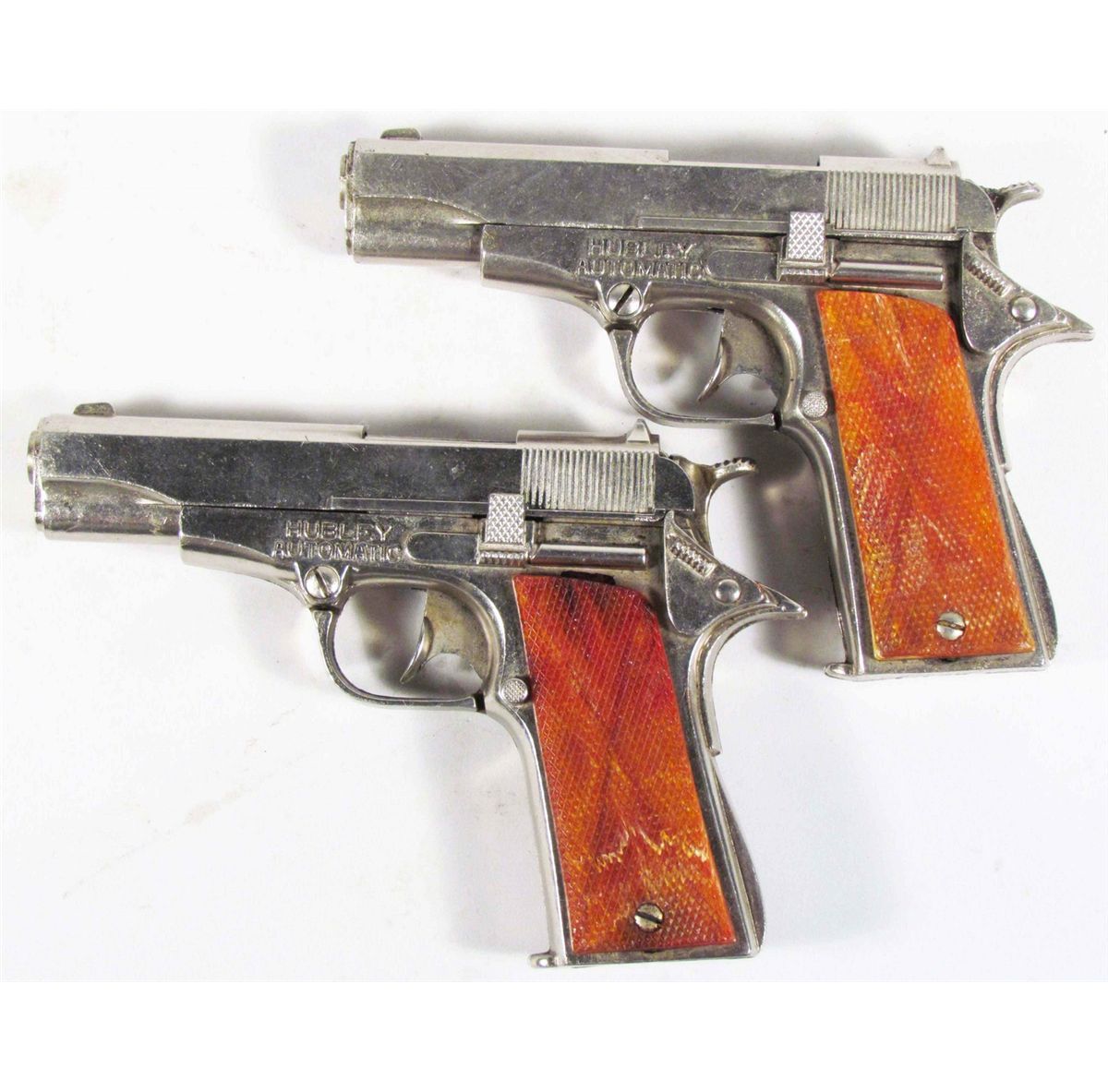 Pair of Hubley "Automatic" Die Cast Cap Guns. Plastic grips with 4 inch barrels. Some minor wear to nickel otherwise good condition.