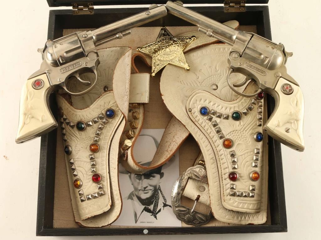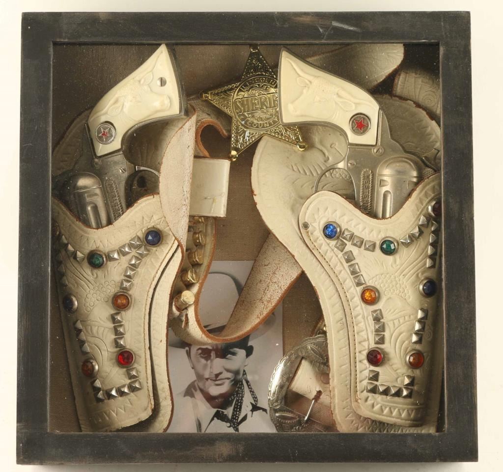 with steer head grips in white faux jewel studded holsters. Mounted in shadow box with badge.