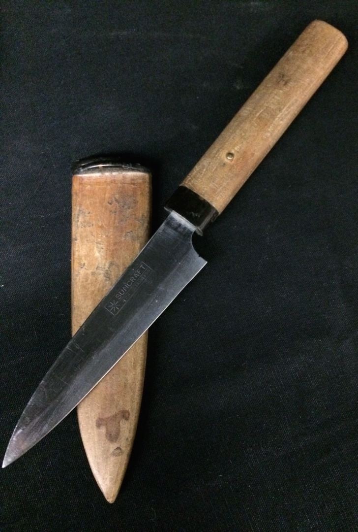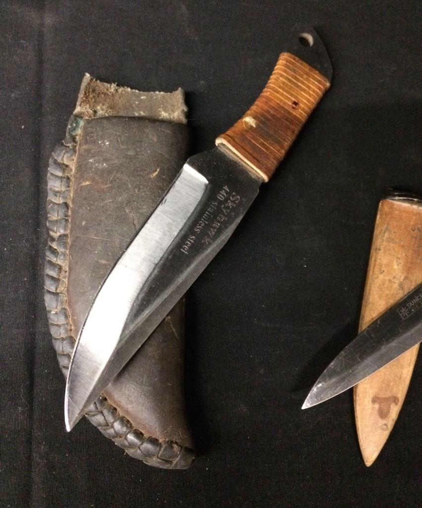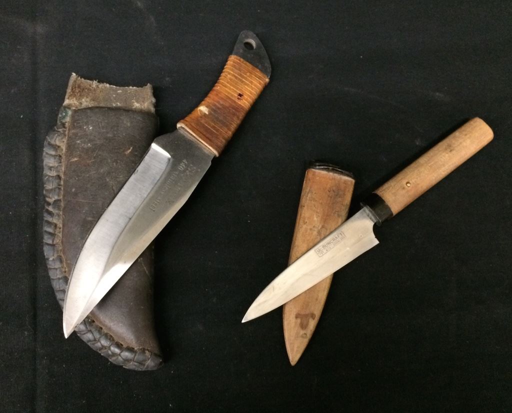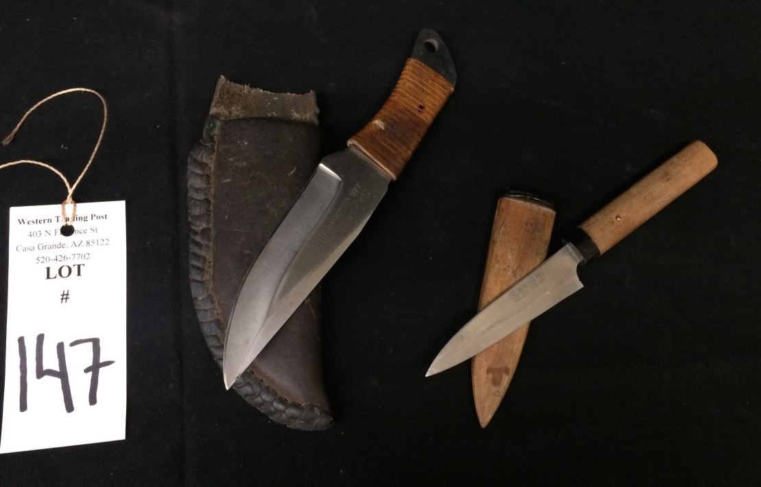 This lot has 2 hunting knives for 1 money! The knife with the leather-wrapped handle is marked Skyhawk and is just over 9” overall including sheath. The wood-handled multi-purpose knife has a wooden sheath and is marked Suncraft and measures 8.5” overall. Shipping: There will be a $5 handling / packaging fee for shipping this lot. The actual cost of postage will be added on top of that.