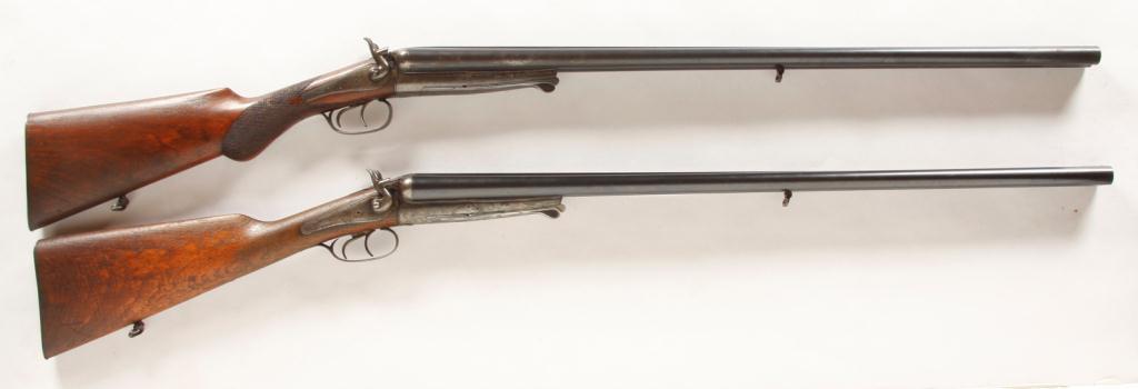 Pair of Husqvarna Mdl 17 12 ga SN:164705/157771, Nice pair of double barrel SxS shotguns made in Sweden. Blued finish, case color receivers with barrel release under the barrel, external hammers,one has smooth wood straight grip stock, the other hasSN:164705/157771, Nice pair of double barrel SxS shotguns made in Sweden. Blued finish, case color receivers with barrel release under the barrel, external hammers,one has smooth wood straight grip stock, the other has a checkered semi-pistol gr stock. Both have 29 1/2" barrels, sling swivels, and steel butt plates. Condition: Good showing some use. Finish thinning on the receiver to about 30% showing some line engraving. Stocks are good and have been stripped and refinished.
