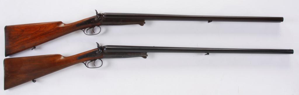 Pair of Husqvarna Shotguns 12 & 16 ga SN:121384/136876. Nice pair of double barrel field grade shotguns with external hammers made in Sweden (1921 & 1927). Blued barrels and receivers, smooth straight grip stocks, 29 1/2" barrels, good bores and actSN:121384/136876. Nice pair of double barrel field grade shotguns with external hammers made in Sweden (1921 & 1927). Blued barrels and receivers, smooth straight grip stocks, 29 1/2" barrels, good bores and actions, double triggers,sling swivels, steel butt plates, barrel release under the receiver. Condition: Good with barrel finish very good, receivers show about 90% finish, stocks are good and appear to be original.