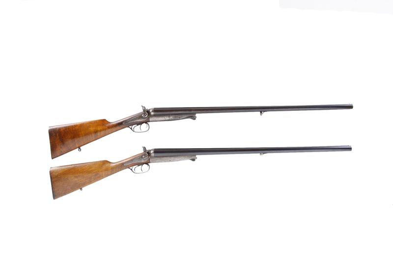 Pair of Husqvarna's Mdl 20 12/16 ga SN:132529,135993, Nice pair of Mdl 20s, one 12 gauge & one 16 gauge, both double barrel, exposed hammer, shotguns made in Sweden, both about 1924. Similar configurations of blued 29 1/2" barrels, case color receivers,SN:132529,135993, Nice pair of Mdl 20s, one 12 gauge & one 16 gauge, both double barrel, exposed hammer, shotguns made in Sweden, both about 1924. Similar configurations of blued 29 1/2" barrels, case color receivers, smooth wood straight gripstocks with steel butt plates, double triggers and sling swivels. Condition: Good to very good with very little thinning to the blue, but the case color is mostly worn, stocks are good with dings and smallscratches from use but no broken or cracked wood. Bores are good and actions function. Great bird guns or for Cowboy Action Shooting.
