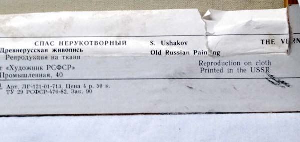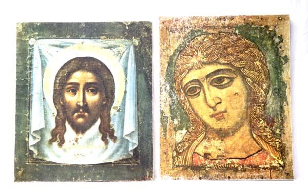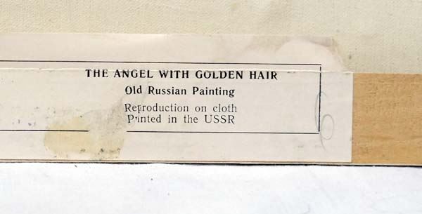 Pair of Icon Reproduction Prints on Cloth done in the USSR. #1 The Angel with Golden Hair, old Russian painting reproduction on cloth printed in the USSR. #2 The Vernicle S. Ushakov, Old Russian Painting reproduction on cloth printed in the USSR. Both measure approx.14.5''H x 12''W.