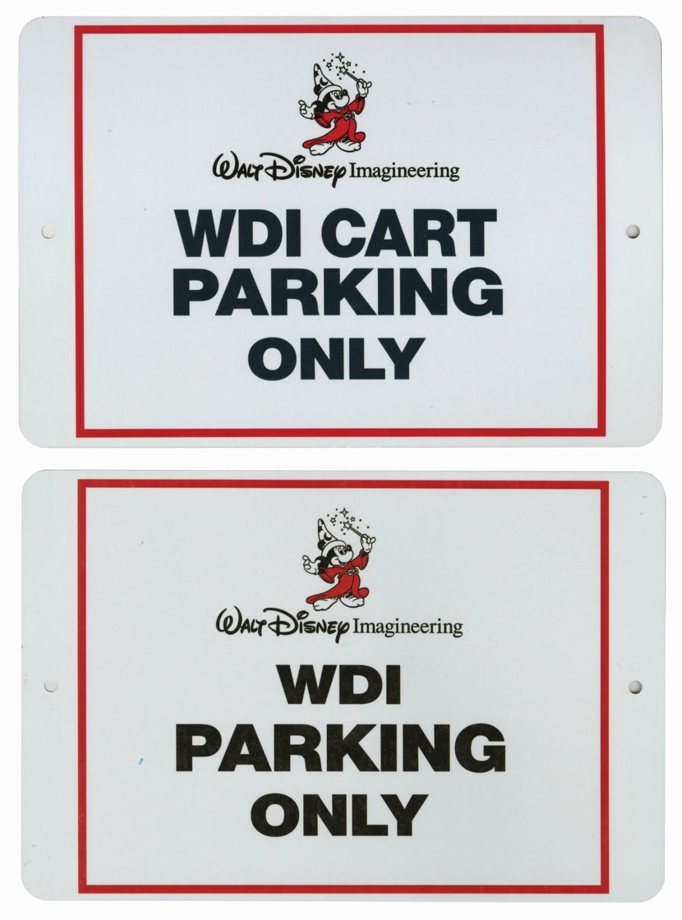 (Walt Disney World, c.1990s) A pair of metal Walt Disney Imagineering parking signs. The signs feature Sorcerer Mickey and were used to designate parking areas, with one sign for cart parking only. Measuring 8"x12" each, the signs are in very good condition with minor surface scratches from use.