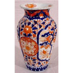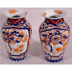 Pair of Imari Vases, Ca. 1900; in shades of blue & burnt orange; bodies are ribbed and end in scalloped rims; very nice condition with some staining on interior; each 12.5" tall x 7" diameter.