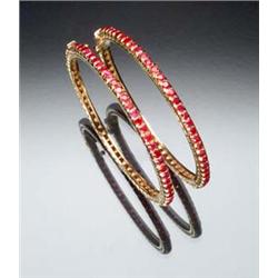 Pair of Indian 22-Karat Yellow Gold and Ruby Bangle Bracelets Each set with sixty-five round faceted rubies weighing approximately 6.50 carats. Total weight of rubies: 13 carats Gross weight: 27.4 dwt $1,000 - $1,500