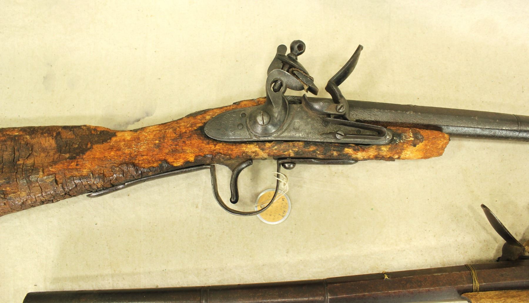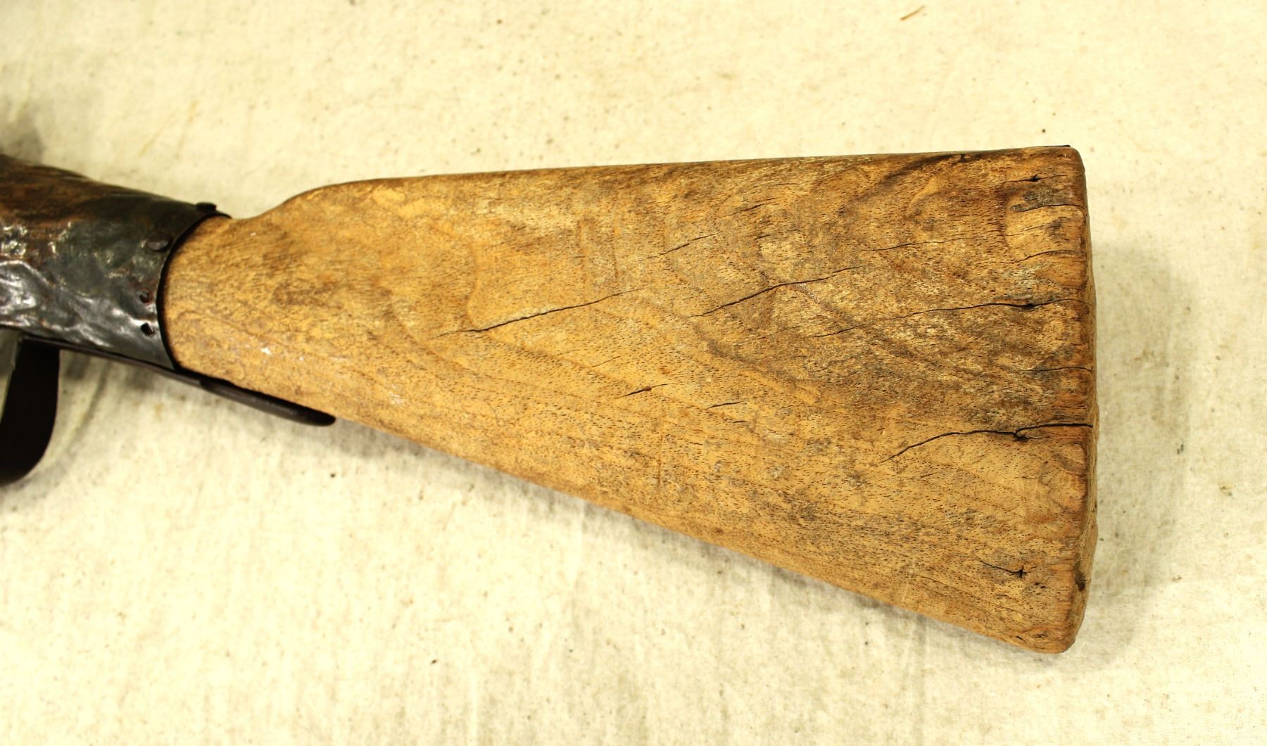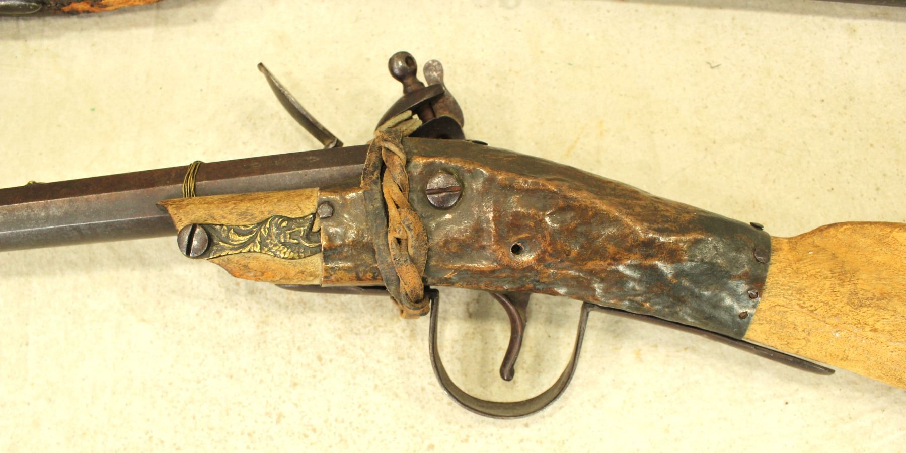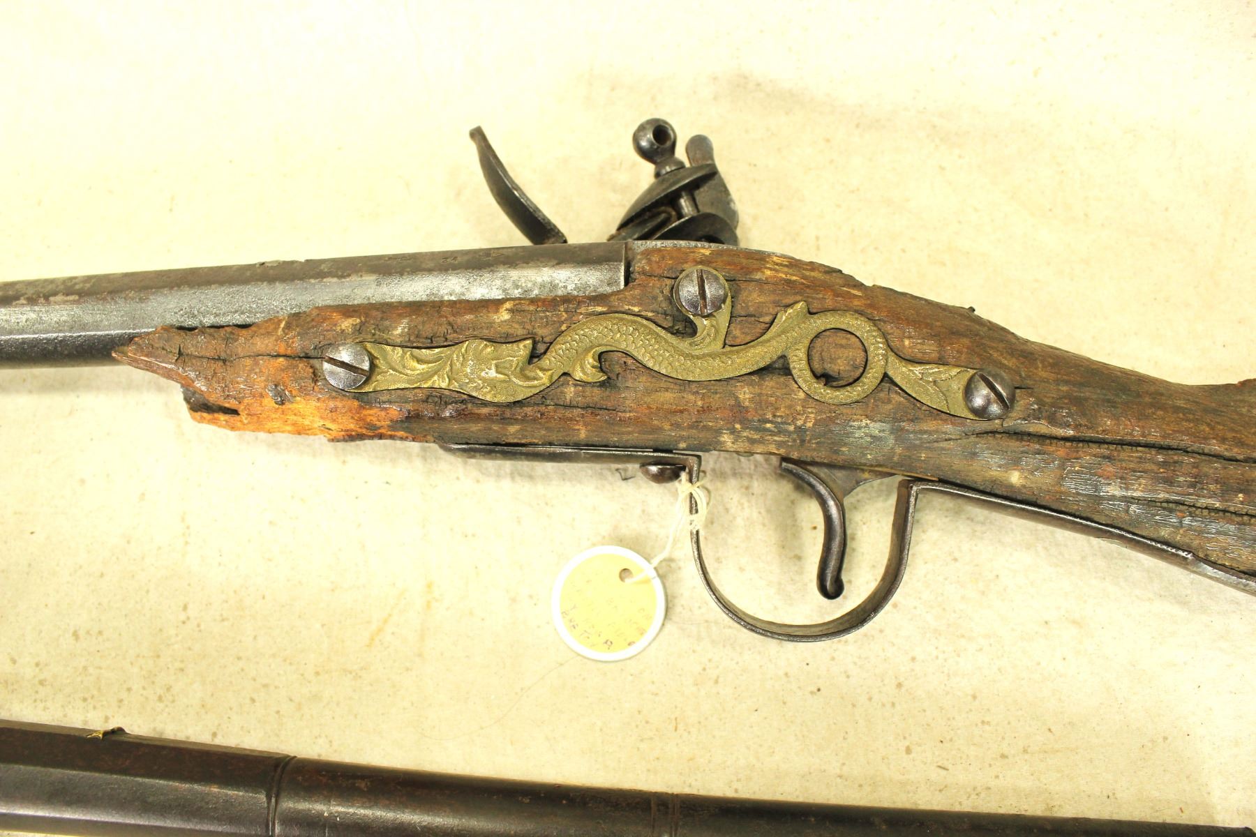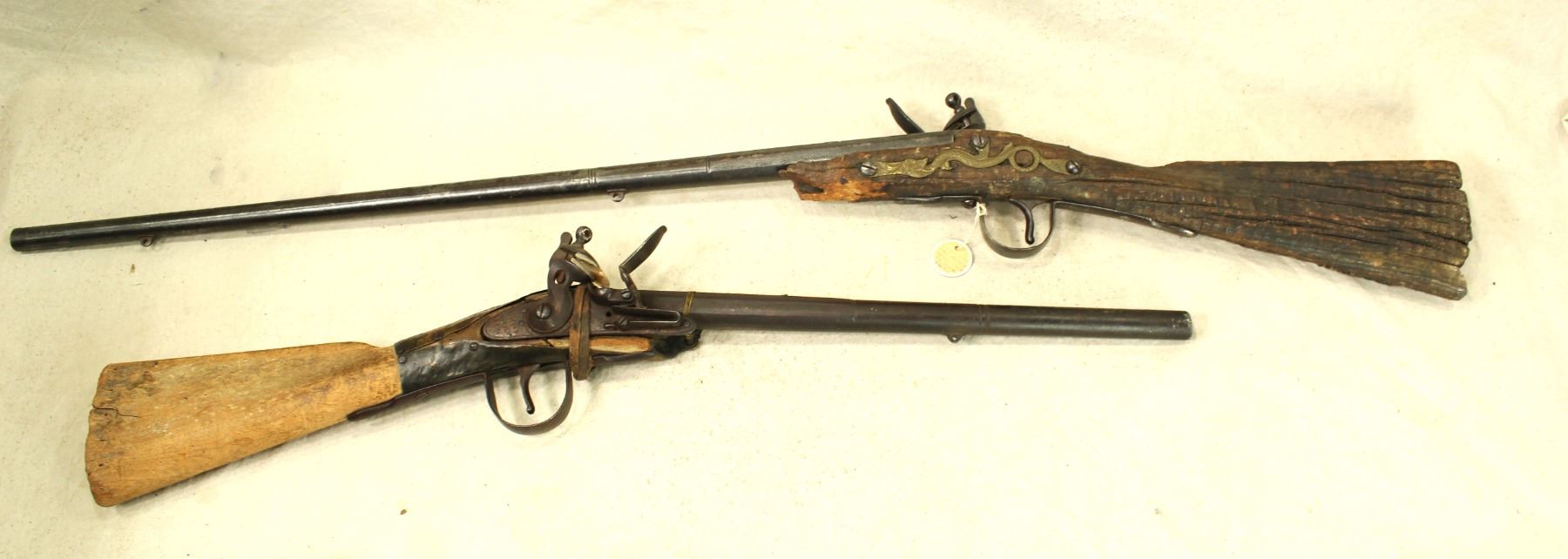 Interesting pair of Northwest Indian Trade guns with part octagon barrels and Flintlock ignition. Circa 1830-50. Traditional brass serpent decoration and blacksmith produced trigger guard. Period of use wood stocks are heavily weathered from exposure to the elements. Smoothbore for Buck & Ball and or solid projectiles. These are the earlier examples of the westward expansion period of trade guns. Not frequently found outside museum exhibition.