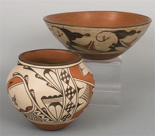 Pair of Indian Pots. (1) 7 ½” x 8”. Santa Ana Turkey design pot. (2) 5” x 13”. Zia Dough Bowl. Nice shape. Shows some rubbing and old crack. (est $600-900)