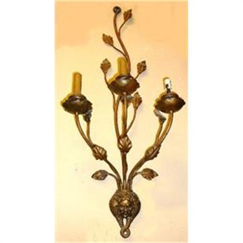 This is a fabulous pair of iron and tole sconces wall lights fixtures with three candlestick lights each. They are adorned with a leaf motif and figural masks.